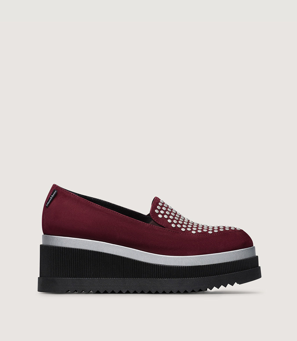 Our slip-on loafer with a playful edge. The velvety black and bordeaux suede upper is topped with a grid of glossy metal studs across the vamp, catching the light with every step. Clean lines, a rounded toe and discreet side gores keep the profile sleek and easy to wear.