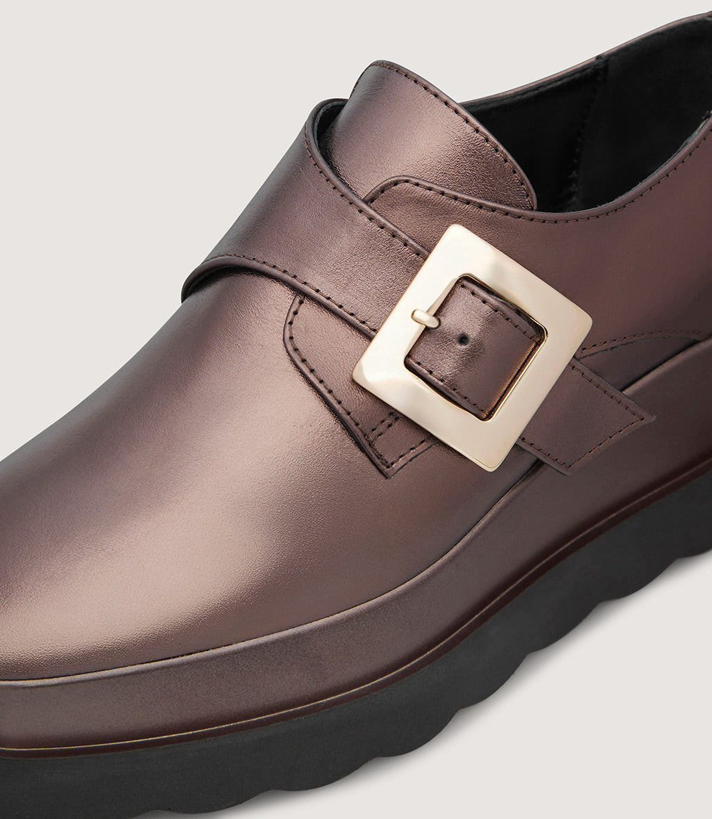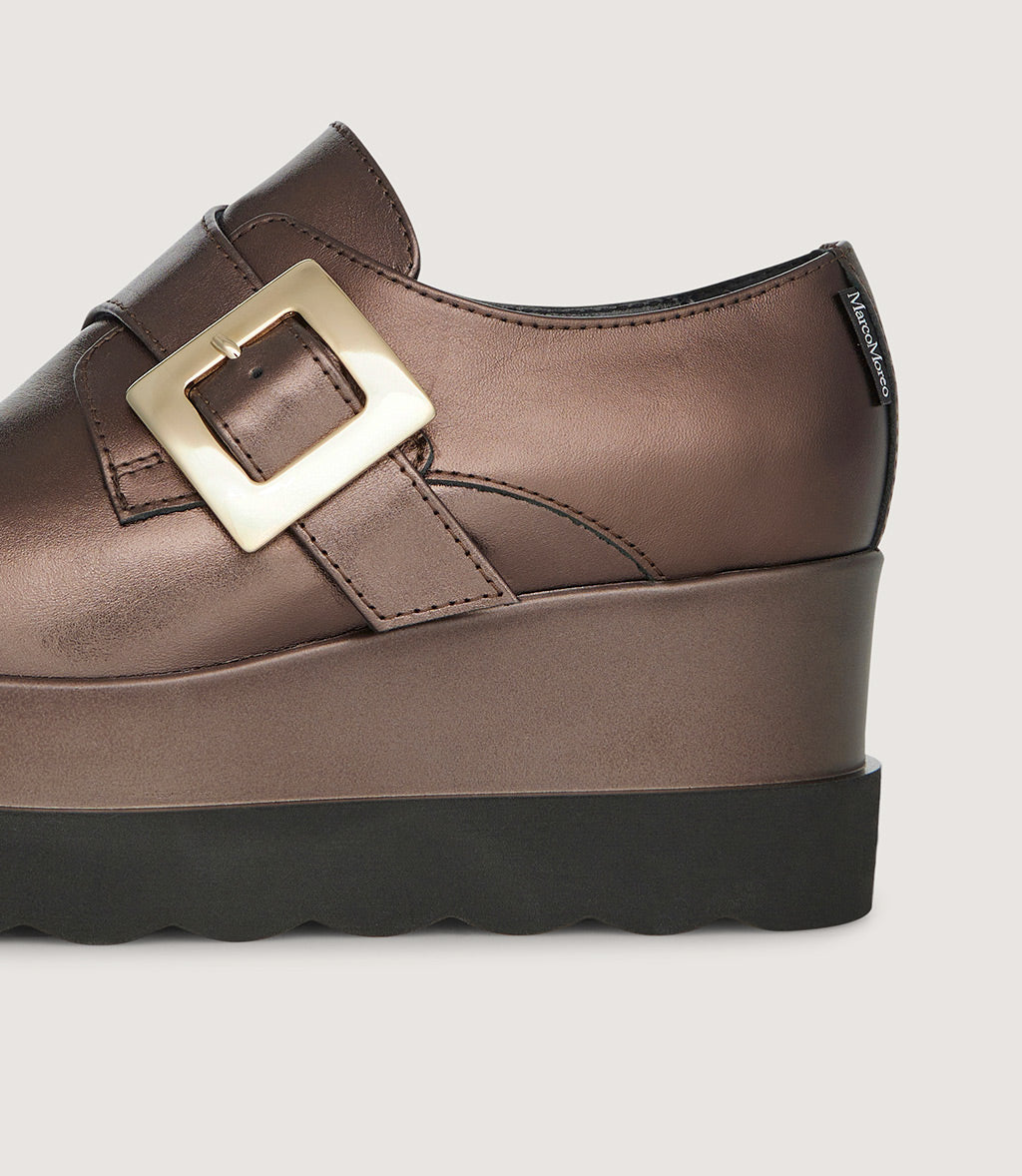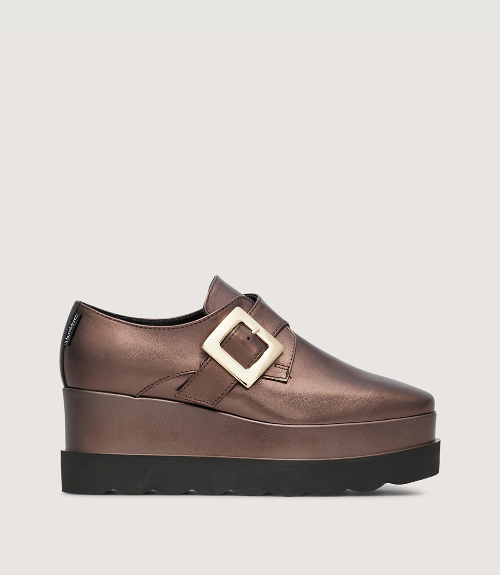 Among the carry overs in the new AW 25/26 collection we have Isla, our modern monk-strap, crafted in velvety black and camel suede, another version is  metallic bronze  and set on the signature lightweight platform. A wide strap topped with an oversized metallic buckle steals the scene, giving clean, graphic lines. Despite the bold volume, the flatform is featherlight and cushioned for all-day comfort, with a wavy tread for secure grip.