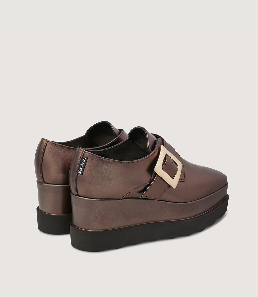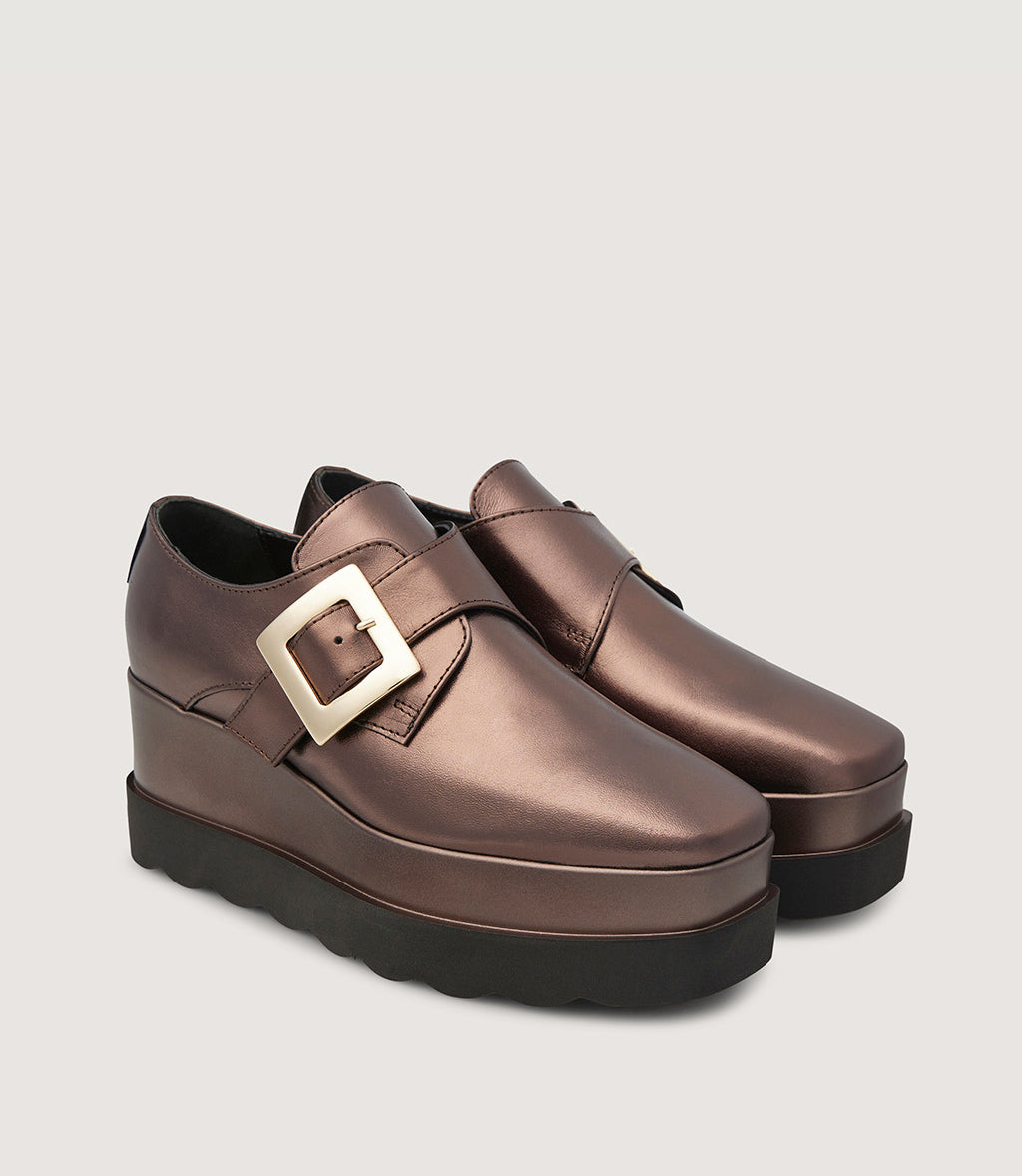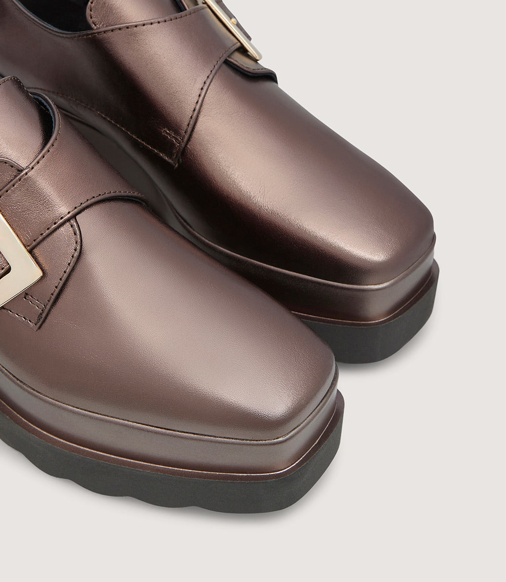 Among the carry overs in the new AW 25/26 collection we have Isla, our modern monk-strap, crafted in velvety black and camel suede, another version is  metallic bronze  and set on the signature lightweight platform. A wide strap topped with an oversized metallic buckle steals the scene, giving clean, graphic lines. Despite the bold volume, the flatform is featherlight and cushioned for all-day comfort, with a wavy tread for secure grip.