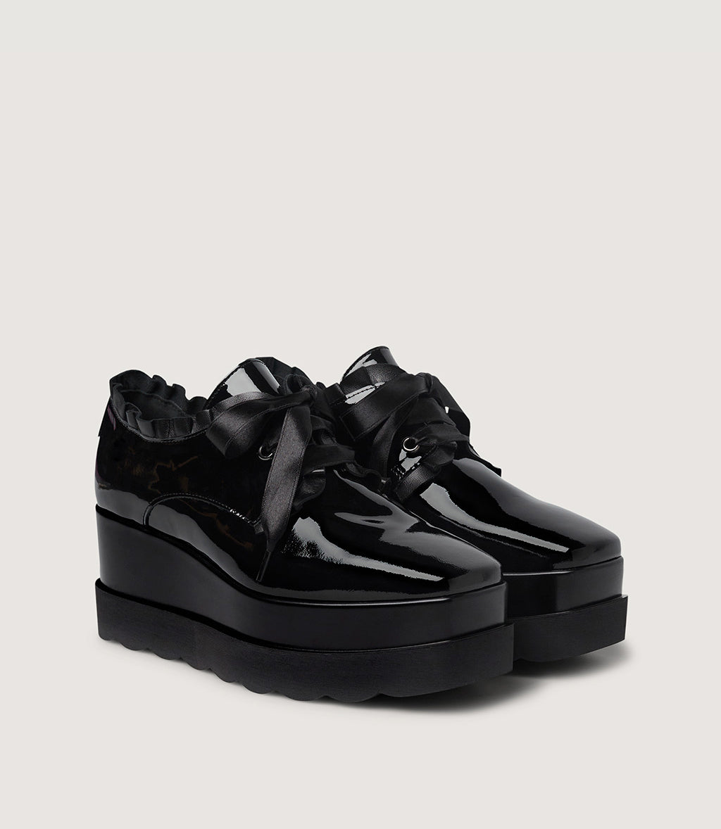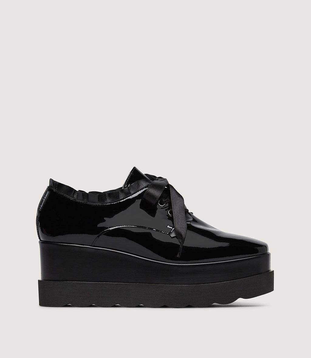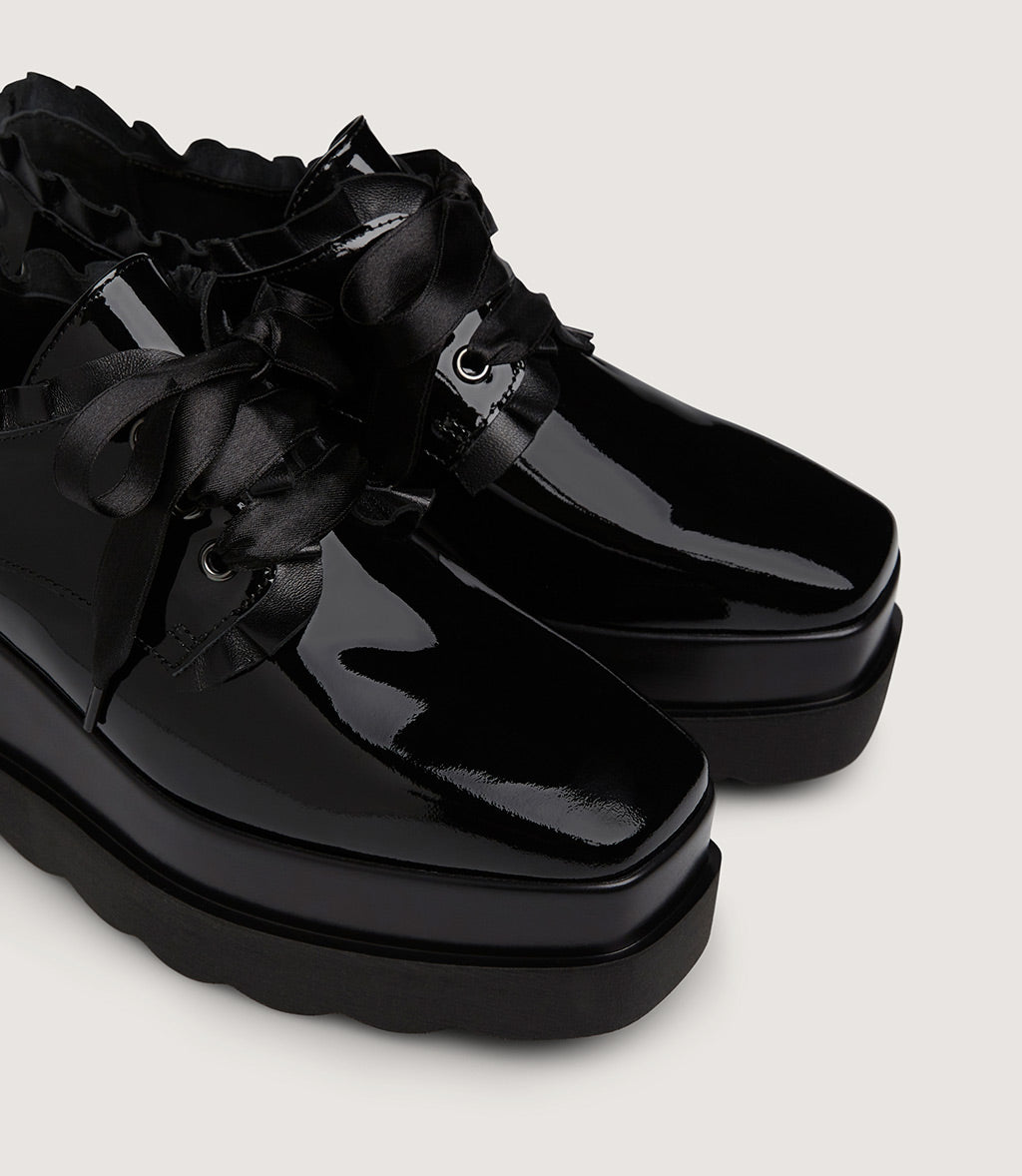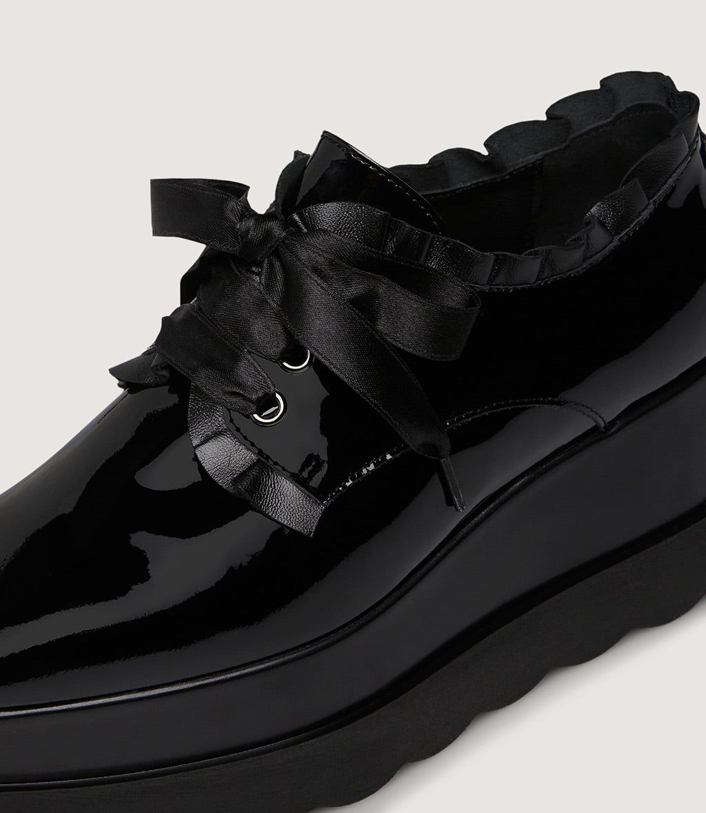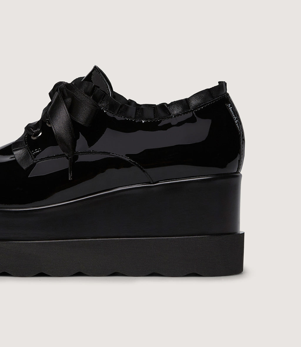 Gabi is our modern platform derby—bold yet irresistibly easy to wear. The high-shine patent upper is finished with glossy satin ribbon laces, while a delicate frill trims the collar for a feminine twist. A sculpted double platform—lightweight and cushioned—adds height without the heaviness, and the rippled outsole ensures a confident stride. The strong toe and signature sole make it unmistakably Marco Moreo—perfect from weekday tailoring to after-dark looks.