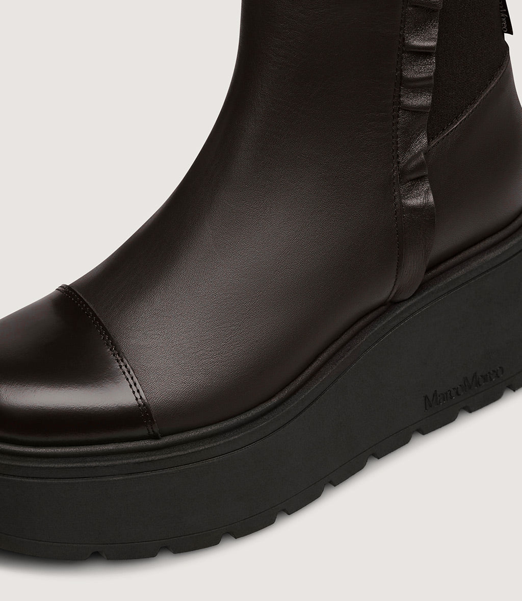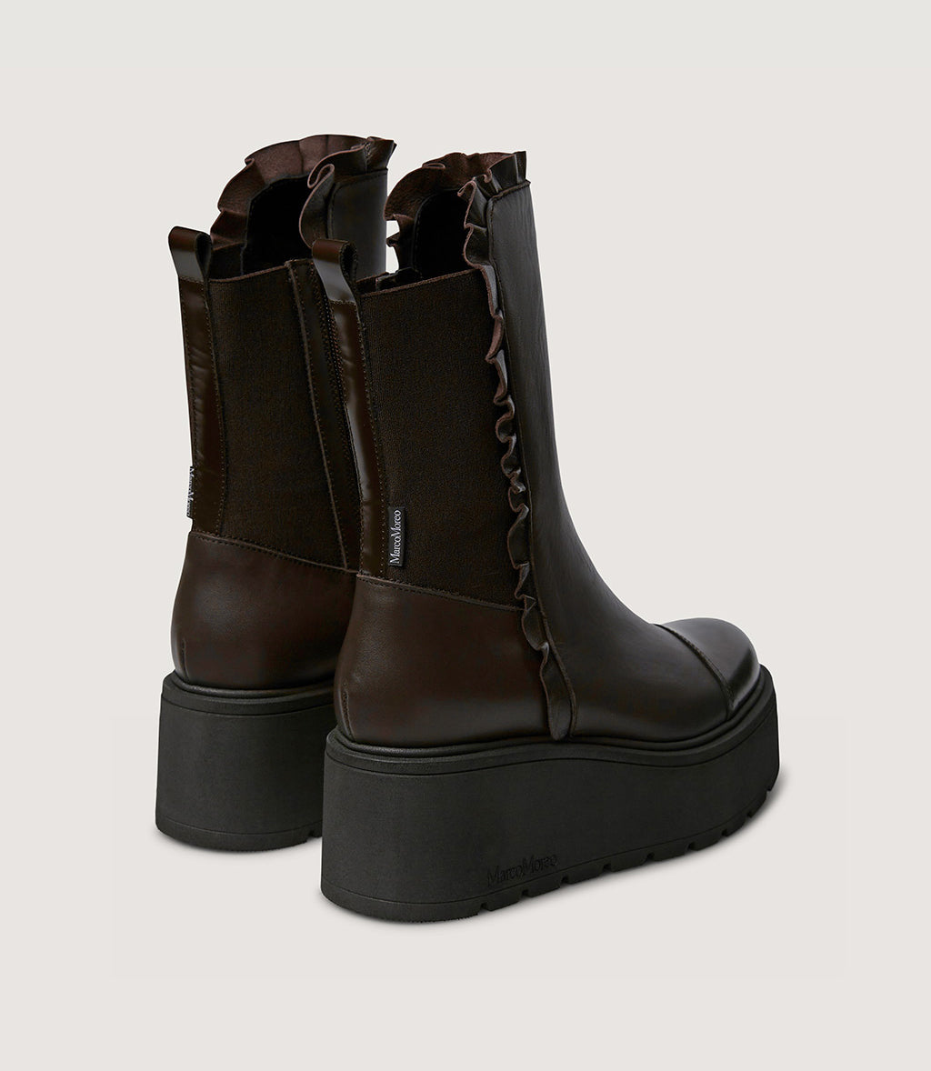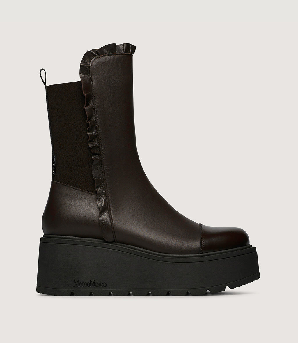 Marlene looks sleek but feels soft and romantic. A gentle ruffle frames the front of the boot, hiding a stretchy insert that makes it easy to slip on. The zipper is hidden inside for a clean look.