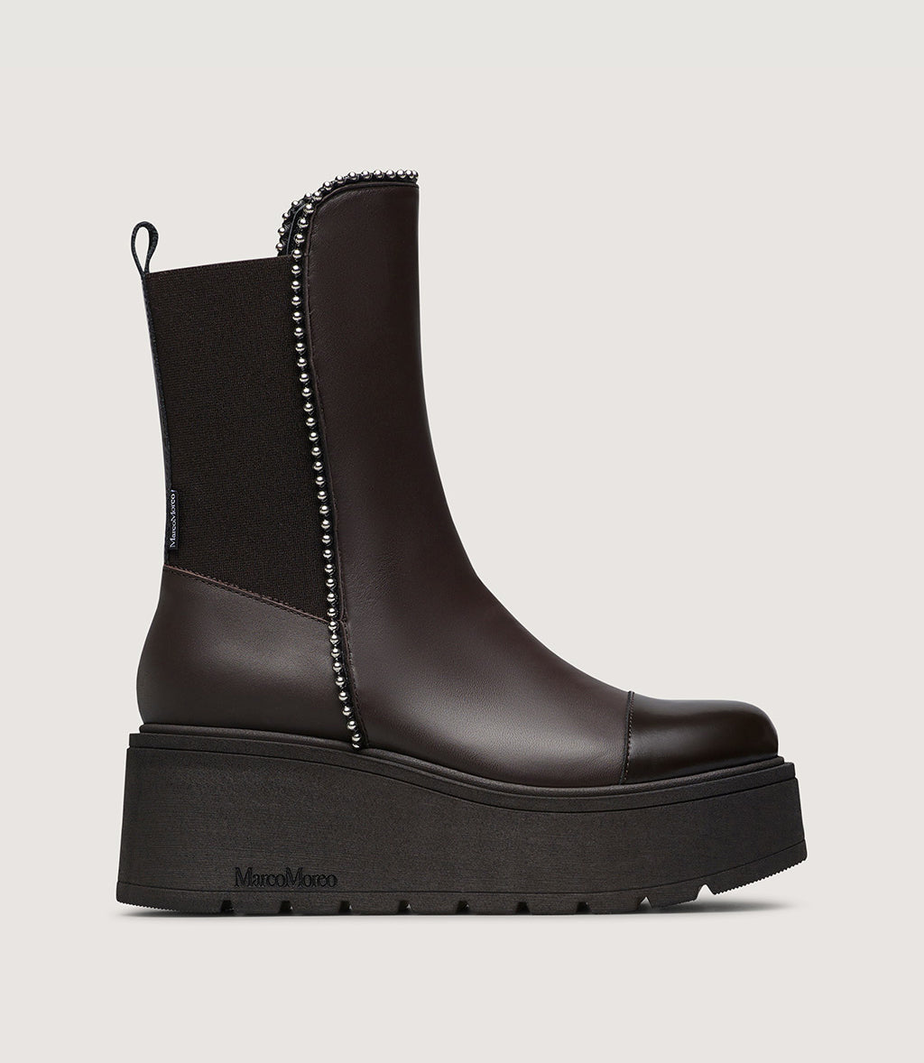 Marlene looks sleek but feels soft and romantic. A gentle ruffle frames the front of the boot, hiding a stretchy insert that makes it easy to slip on. The zipper is hidden inside for a clean look. It achieves this with nickel-coloured studs that frame the front of the shaft and highlight the gap between the upper and the toe.