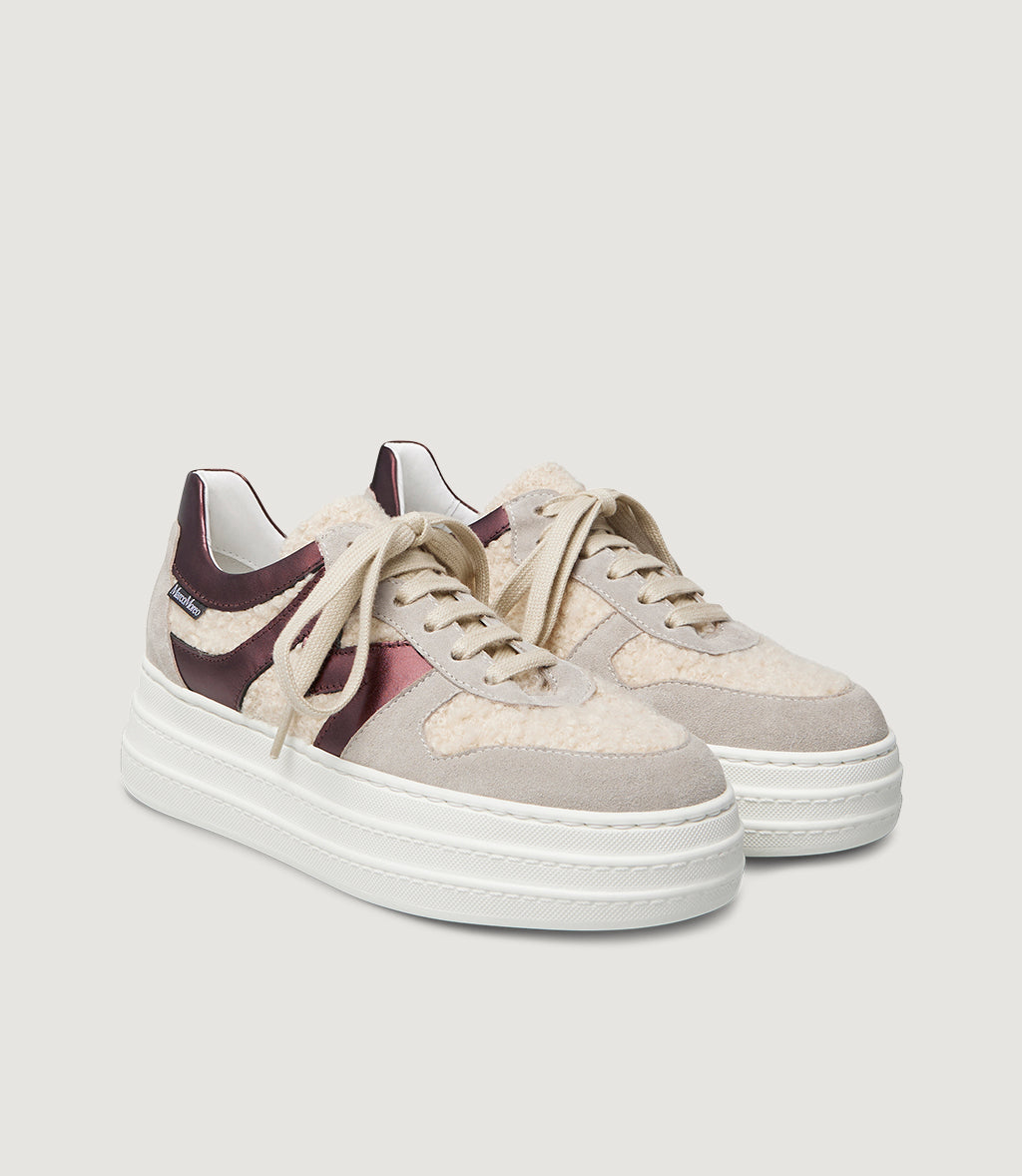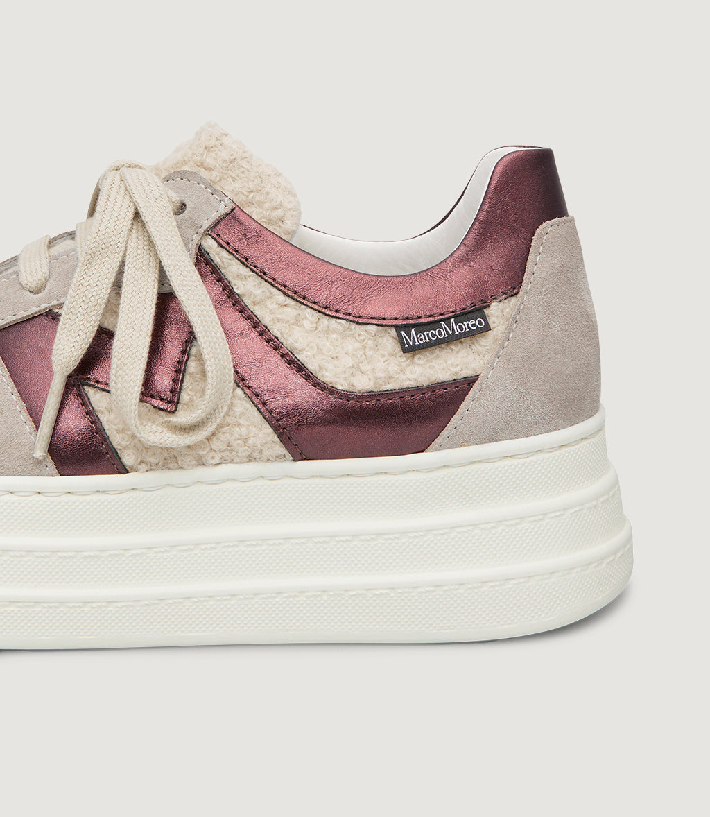 The laminated “moro” bronze leather shines softly while smooth dark-brown,beige and gun metal  nappa traces the iconic side M. Set on a lightweight platform, it lifts your look and cushions every step.