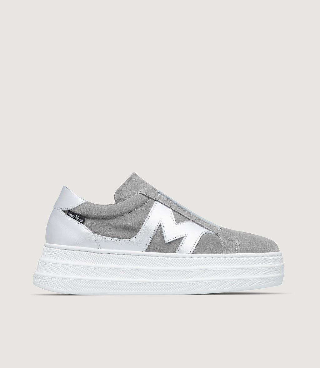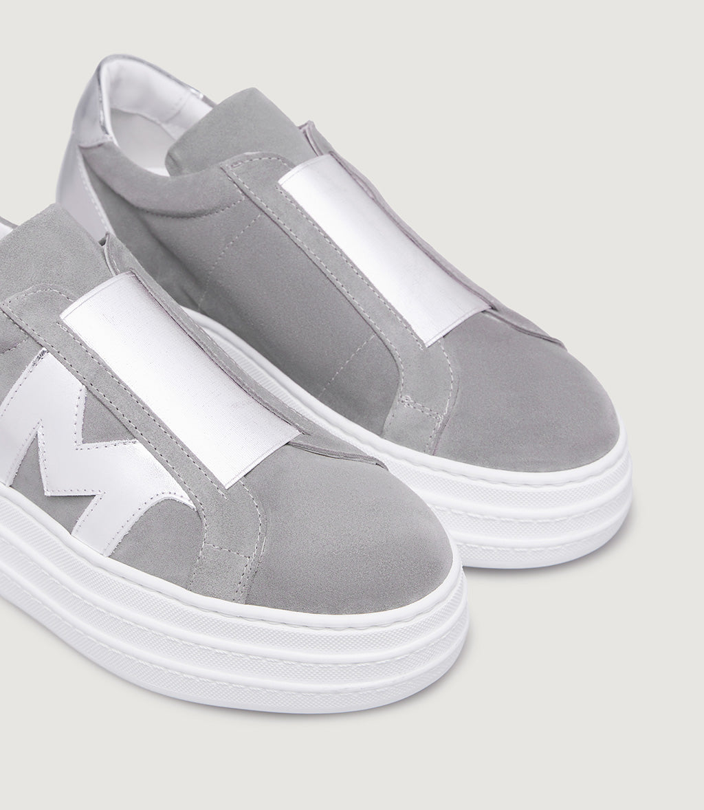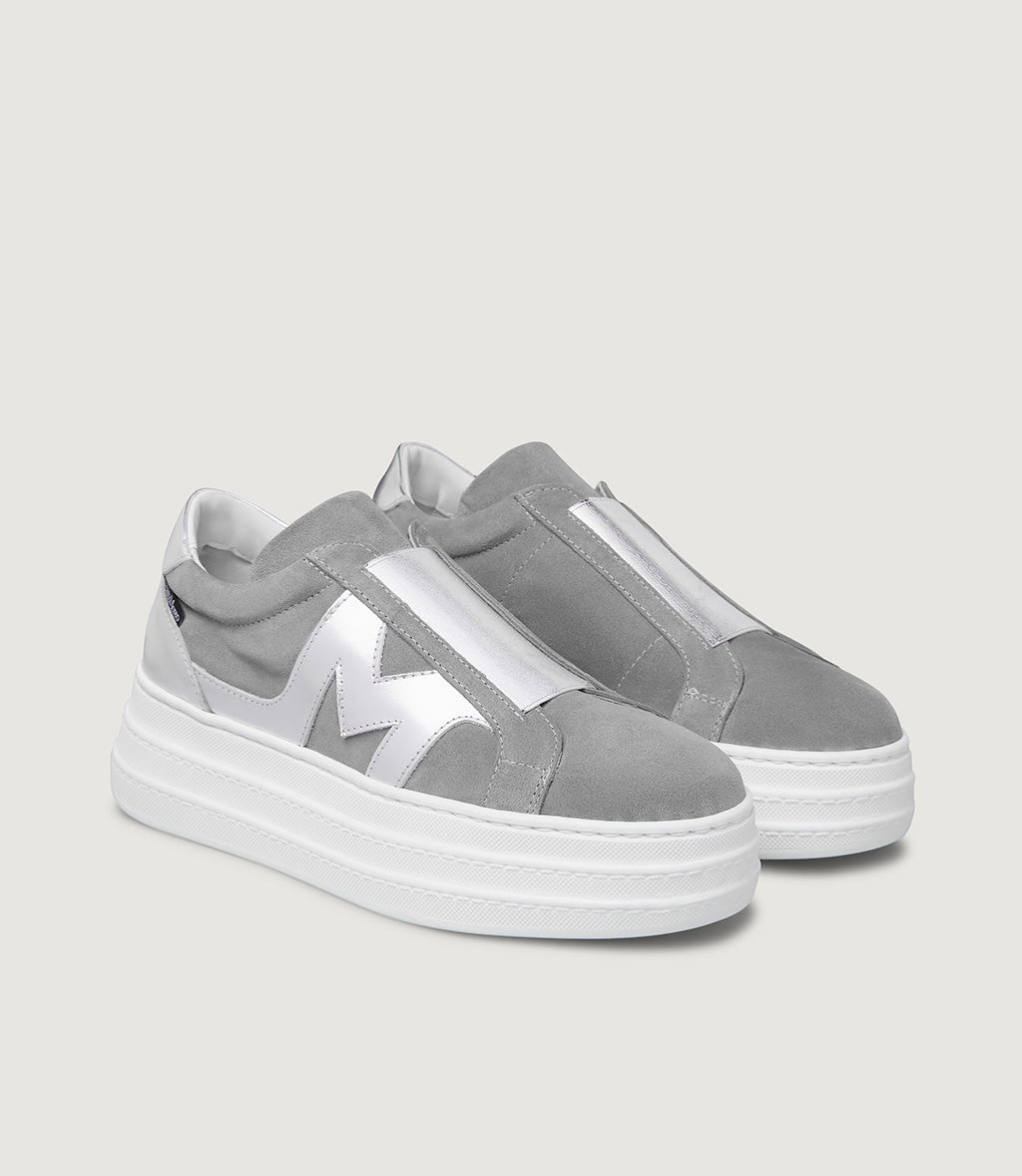 Aretha is one of the models from our MRC57 capsule collection dedicated to sneakers. Compared to the classic trainer, she flaunts a noticeably higher sole (with a heel of 5 cm and a toe of 3.5 cm) and distinctly lacks any laces, which are replaced by a laminated elasticated band that makes her easy to slip on and super comfy to wear. She is available in two versions, both in suede, with the outer side embellished by the iconic “M” that distinguishes the models belonging to this MOREO Collection.