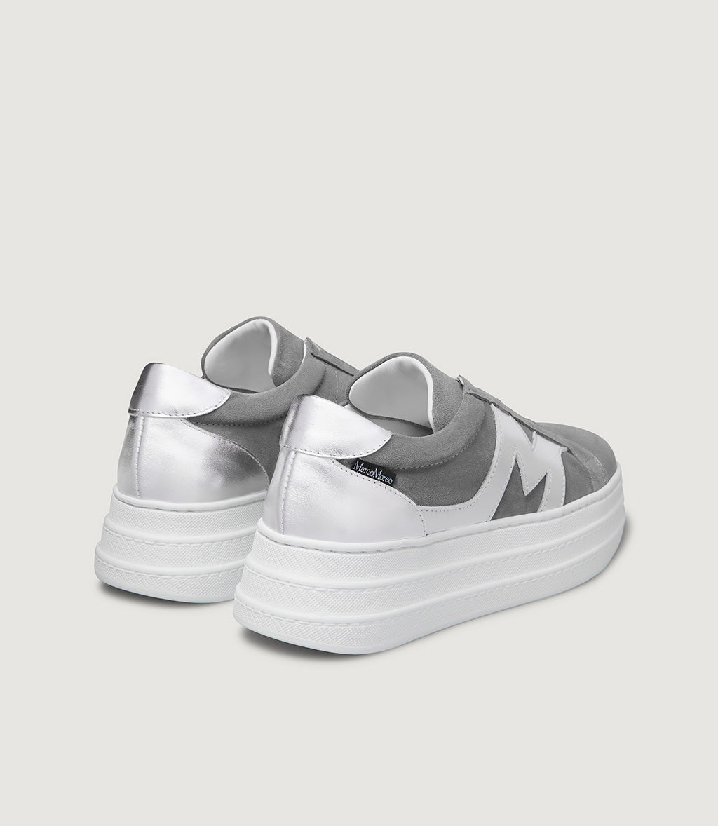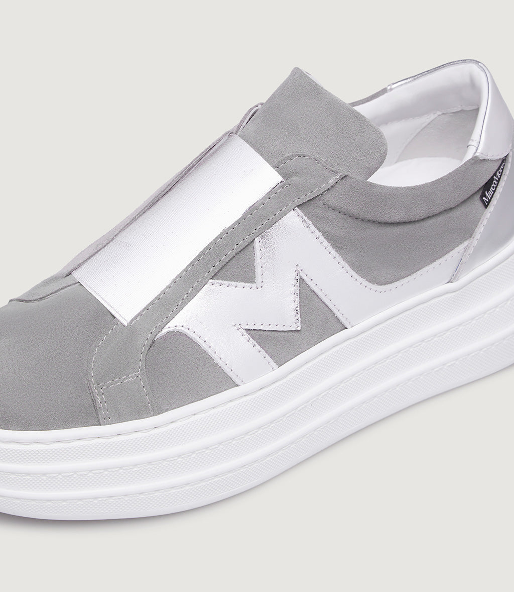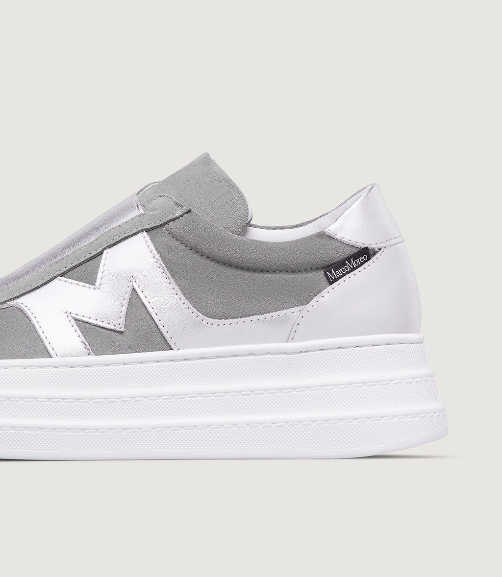 Aretha is one of the models from our MRC57 capsule collection dedicated to sneakers. Compared to the classic trainer, she flaunts a noticeably higher sole (with a heel of 5 cm and a toe of 3.5 cm) and distinctly lacks any laces, which are replaced by a laminated elasticated band that makes her easy to slip on and super comfy to wear. She is available in two versions, both in suede, with the outer side embellished by the iconic “M” that distinguishes the models belonging to this MOREO Collection.