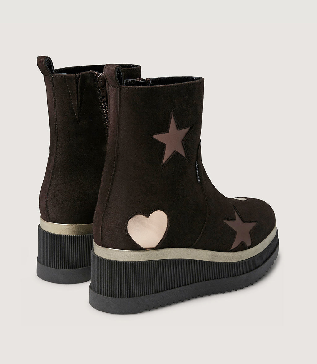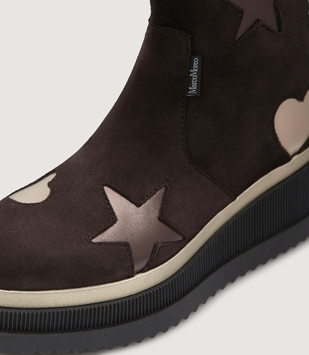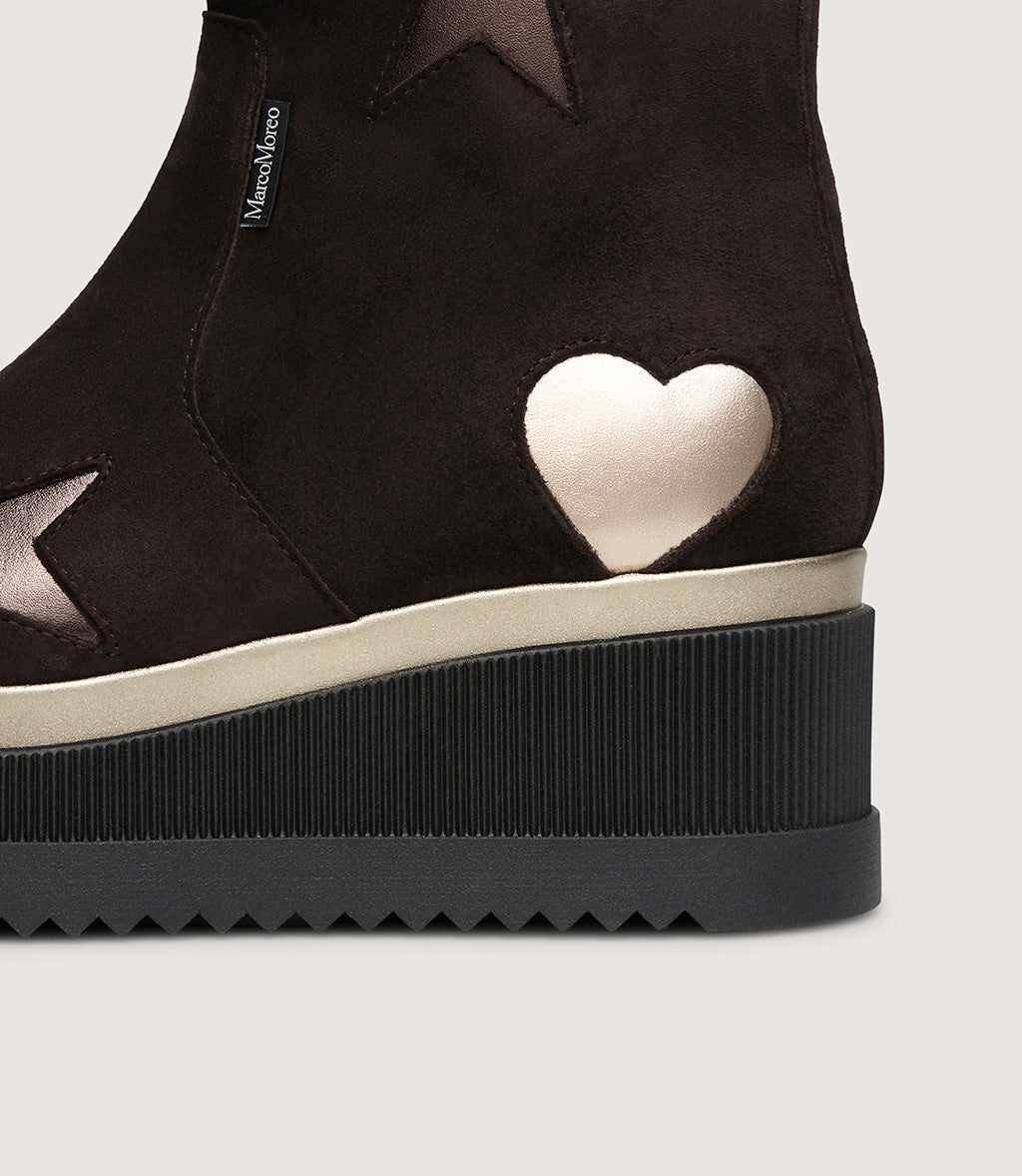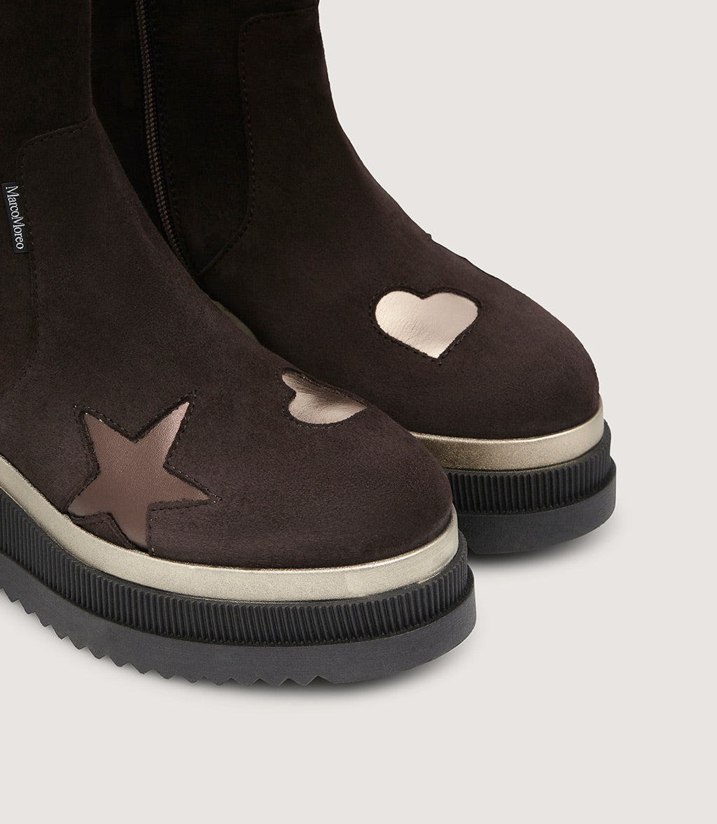 Corinne is the most classic of ankle-boots, with clean and elegant lines that ooze a romantic style. Marco Moreo’s iconic star and heart decoration from previous models and collections returns, and this time the tones are gold and bronze, for a play of light and reflections that warms every step!