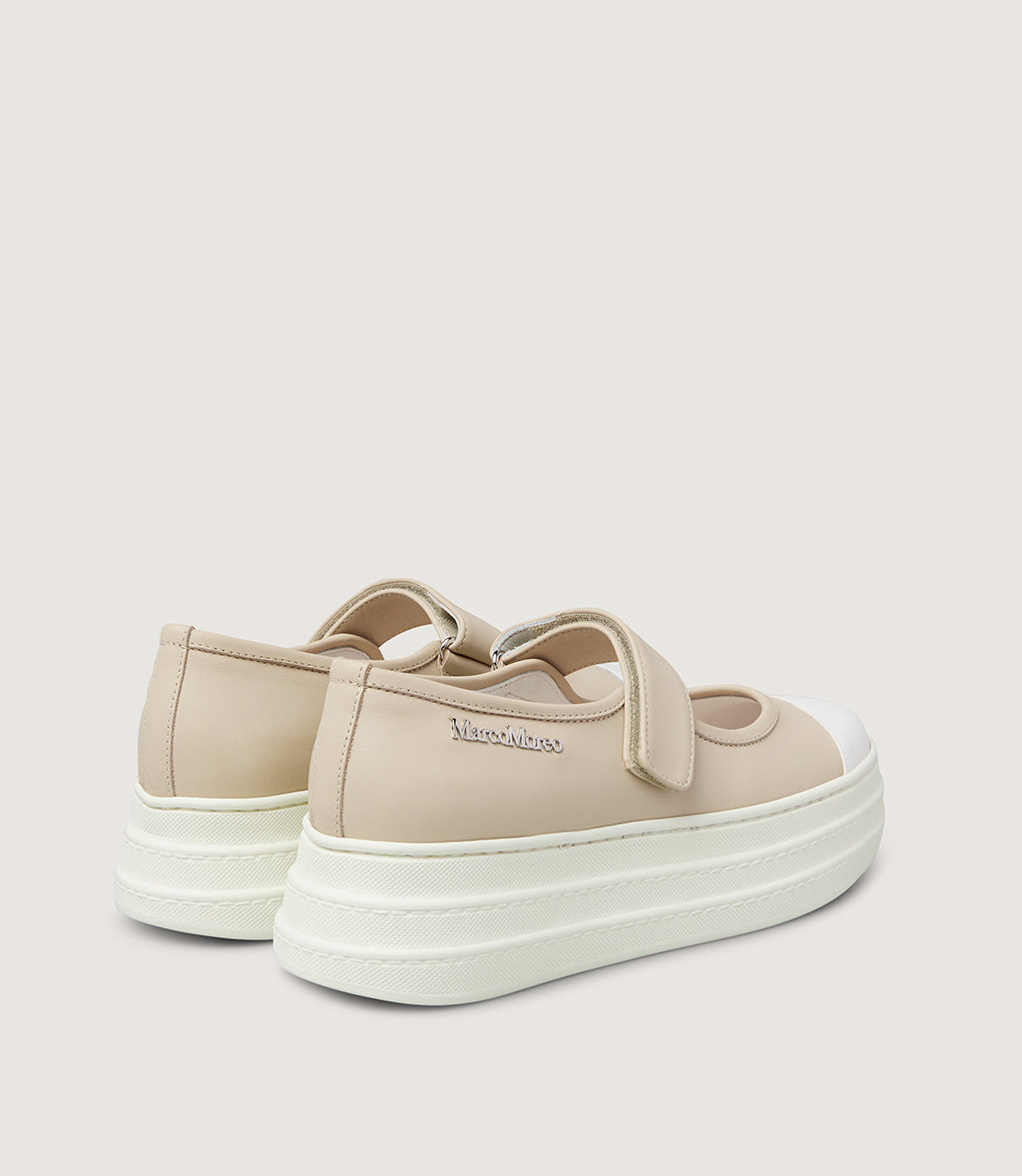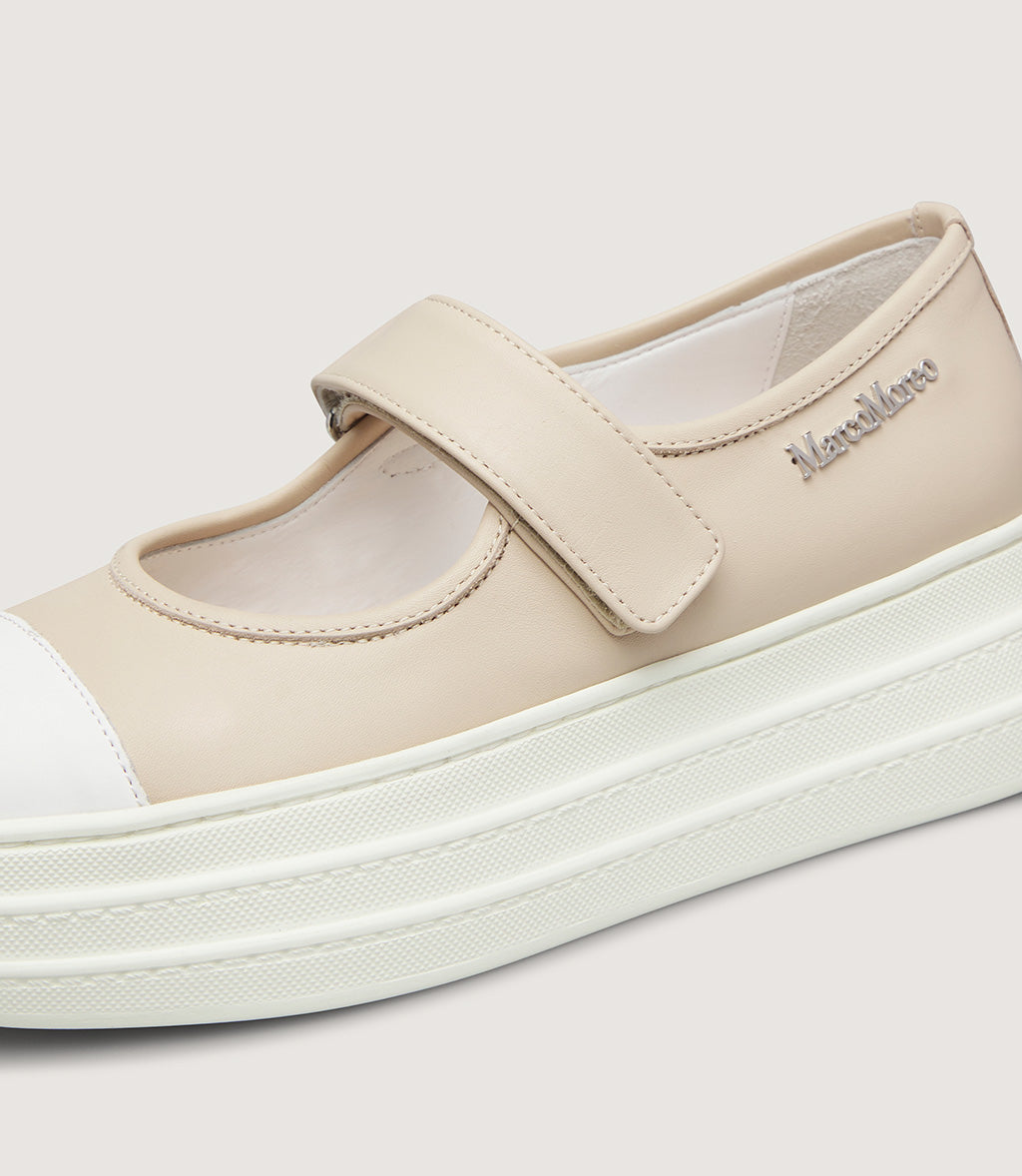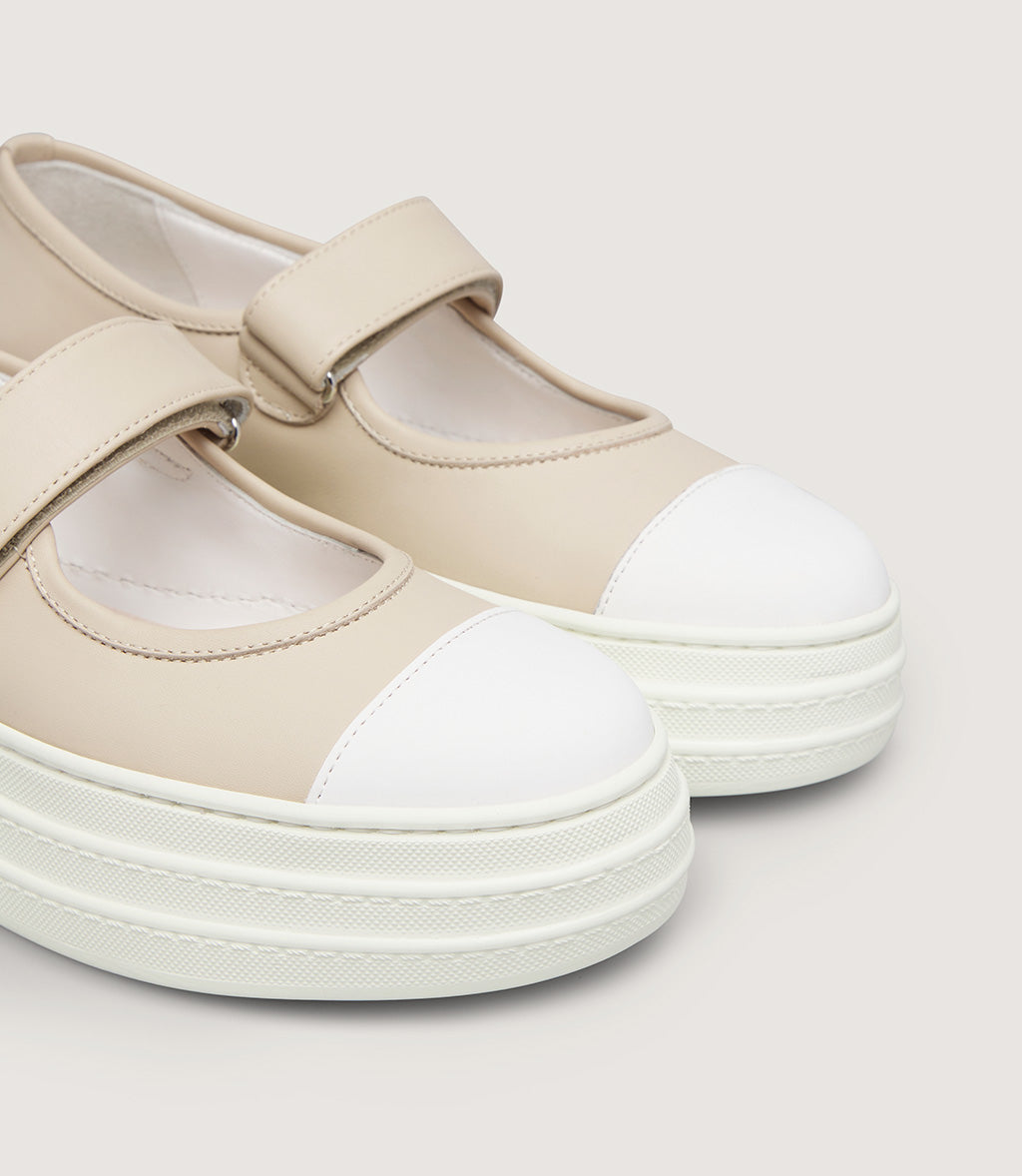 A stylish twist on a classic silhouette, this platform Mary Jane sneaker offers a perfect blend of comfort and contemporary design. Crafted from smooth beige leather, it features a secure Velcro strap across the instep for easy wear and a clean, streamlined look. The white rubber toe cap and exaggerated chunky sole add a modern edge, elevating everyday casual outfits with bold style.