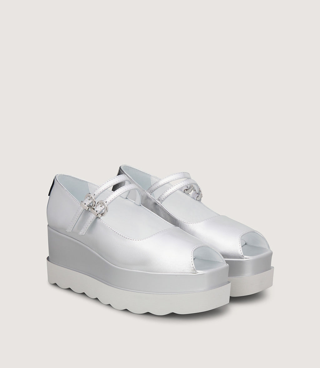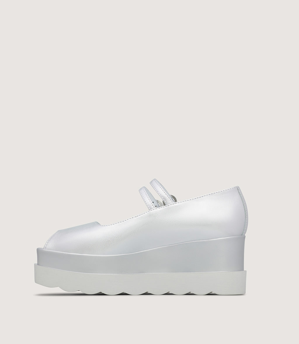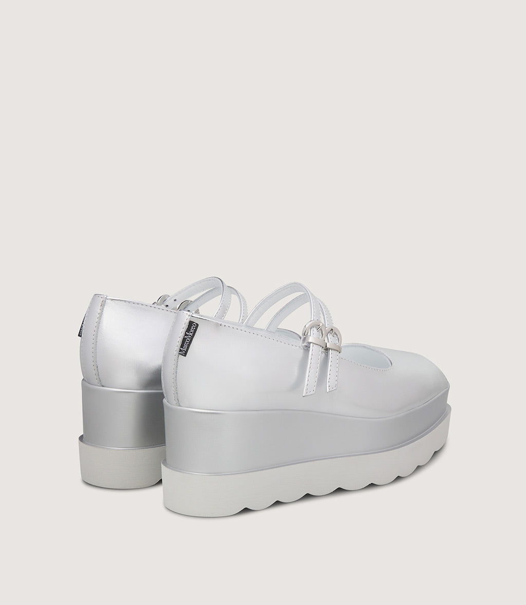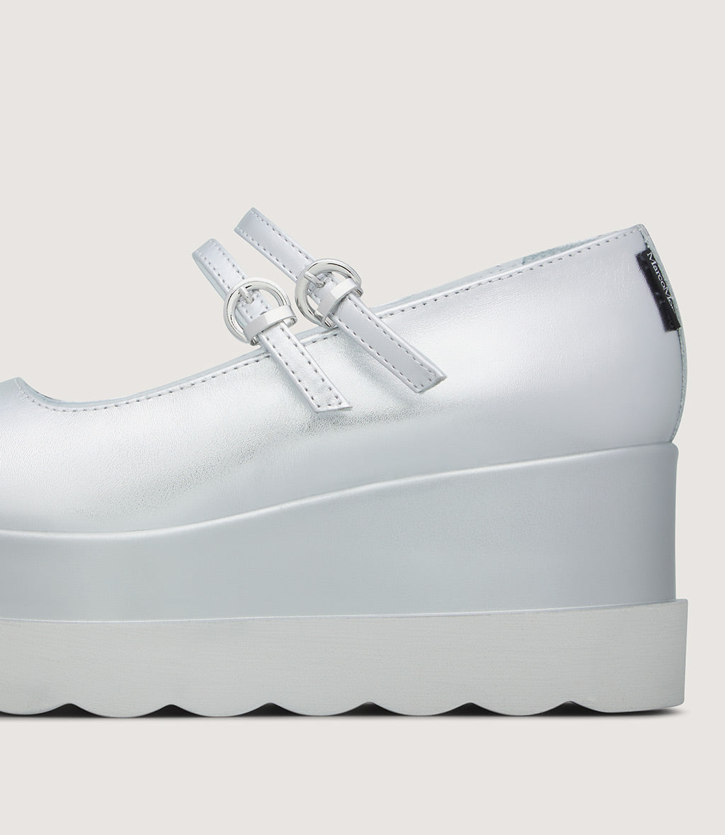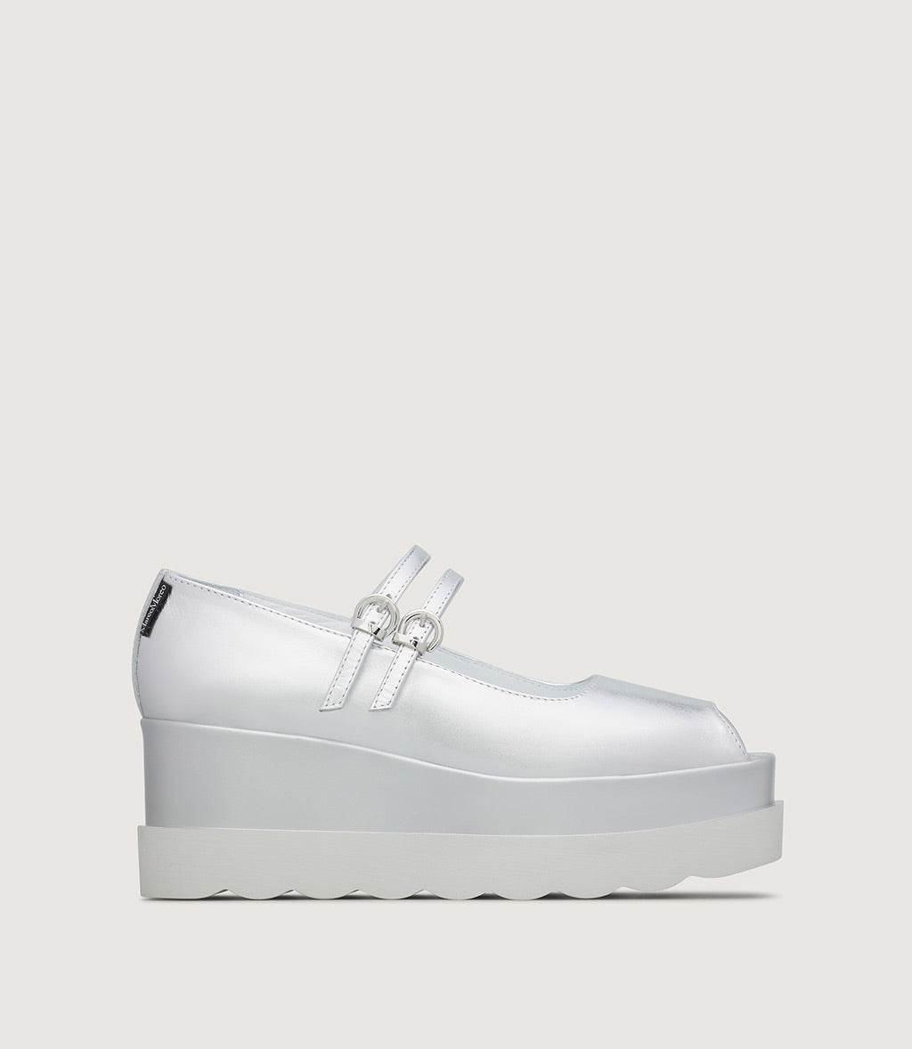 This modern Mary Jane combines soft textures with a bold, contemporary silhouette. Crafted from soft laminated leather, the upper is enhanced by a delicate strap with a metallic buckle, offering both style and a secure fit.