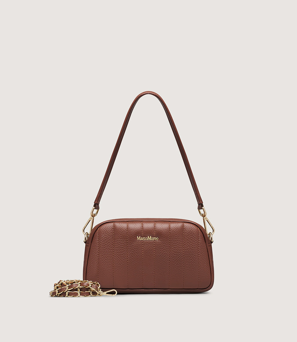 Compact yet functional, it measures 24 × 13 cm and features refined vertical stitching, a secure top zipper, and a detachable shoulder strap for versatile styling.