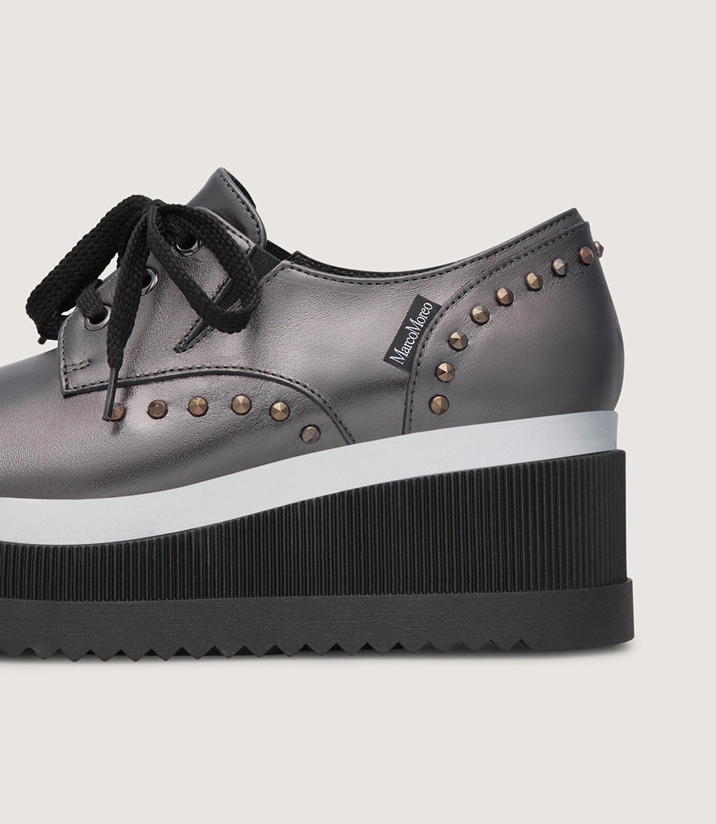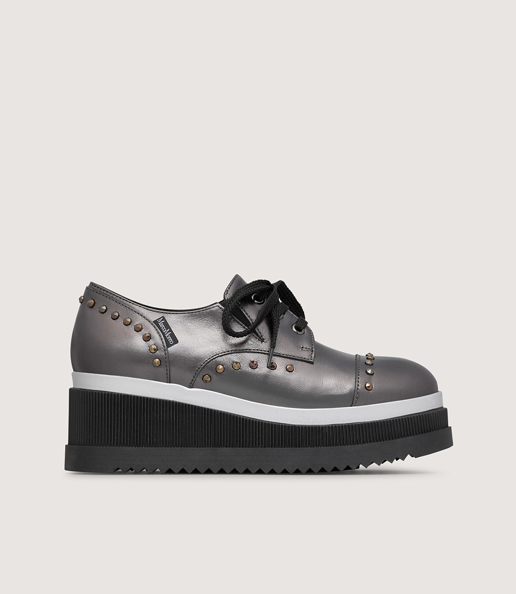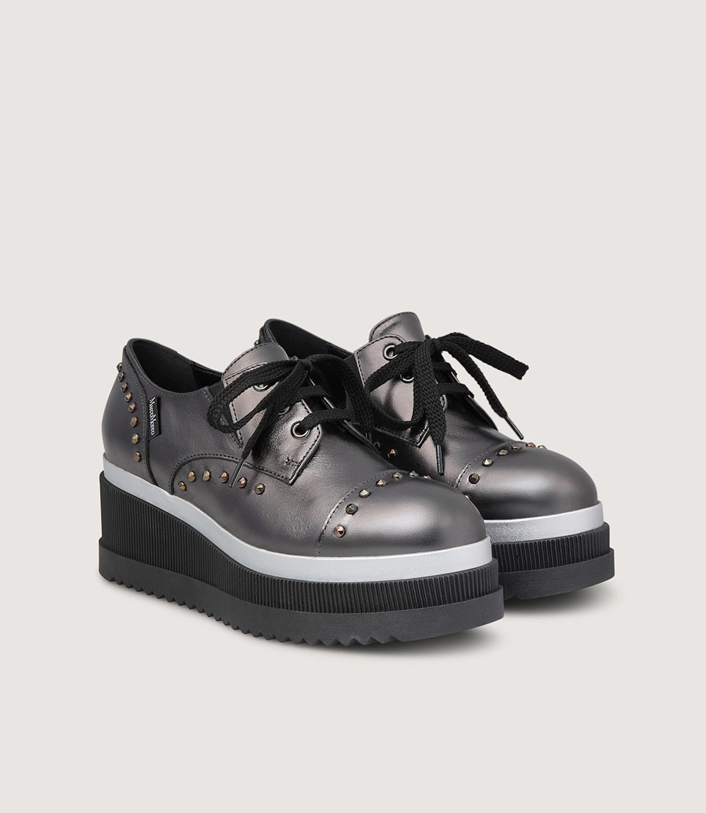 Leslie is a brogue, with studs that give her an edgy attitude. Elegant yet casual, she combines comfort with height thanks to our iconic high sole, featuring a laminated insert and a white, ribbed-effect rubber platform.
