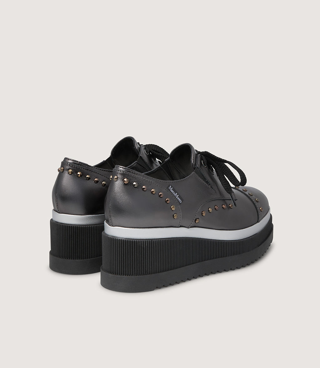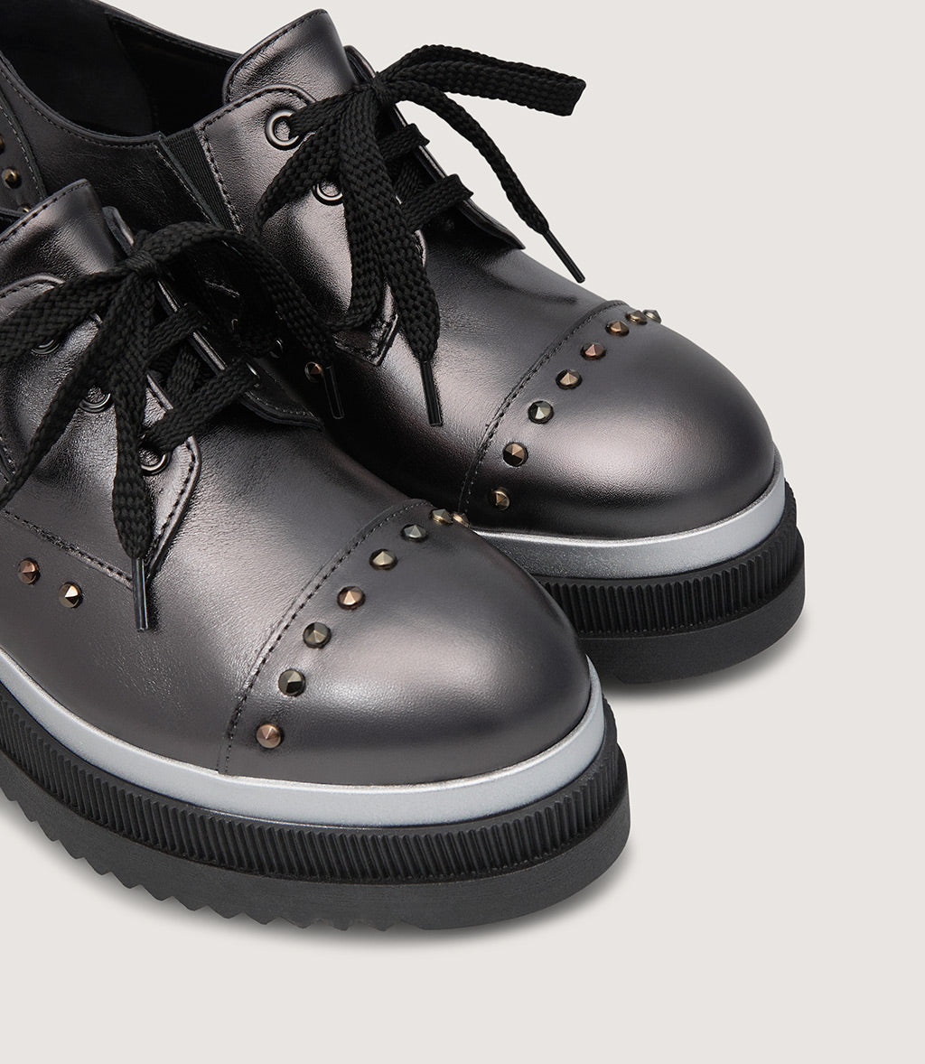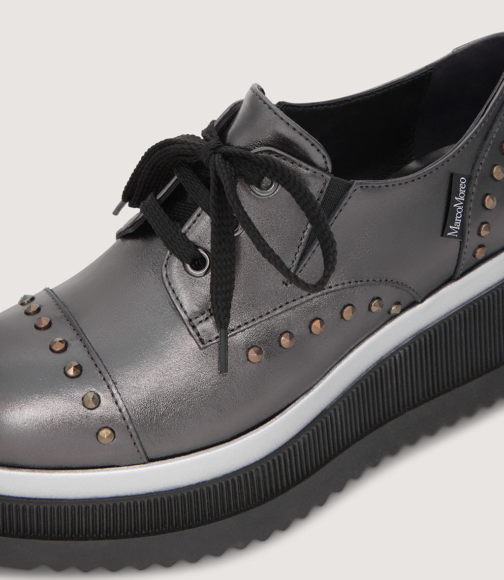 Leslie is a brogue, with studs that give her an edgy attitude. Elegant yet casual, she combines comfort with height thanks to our iconic high sole, featuring a laminated insert and a white, ribbed-effect rubber platform.