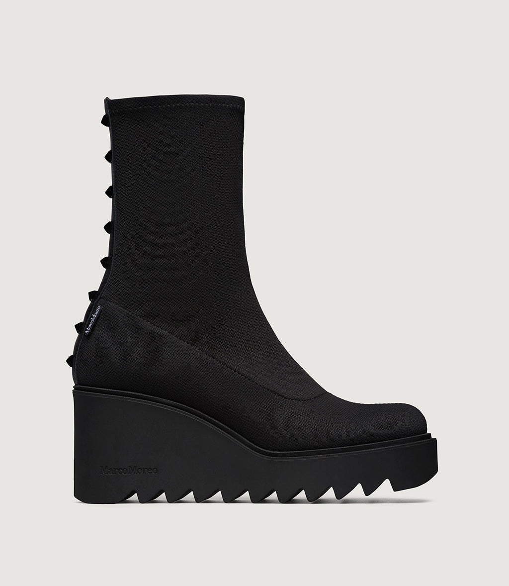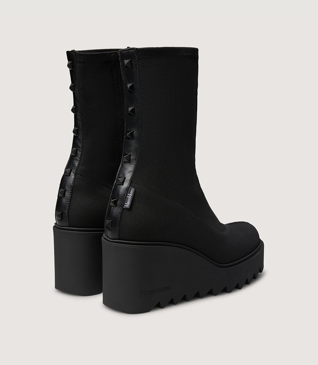 Elevate your look with these Italian-made  stretch ankle wedge boots. Featuring a sculptural platform sole, sleek fit, and refined stud detailing for timeless modern style.
