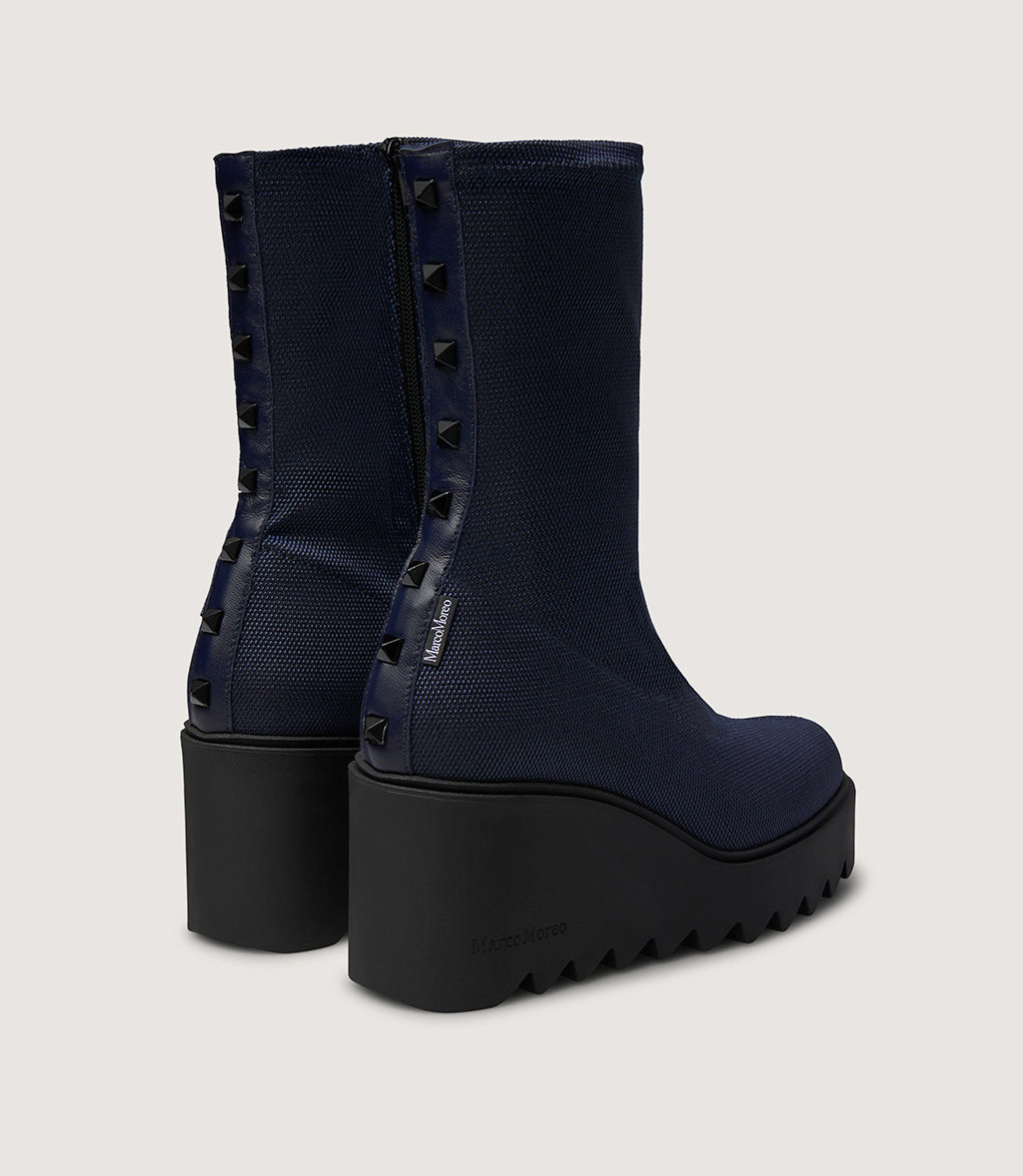 Elevate your look with these Italian-made  stretch ankle wedge boots. Featuring a sculptural platform sole, sleek fit, and refined stud detailing for timeless modern style.