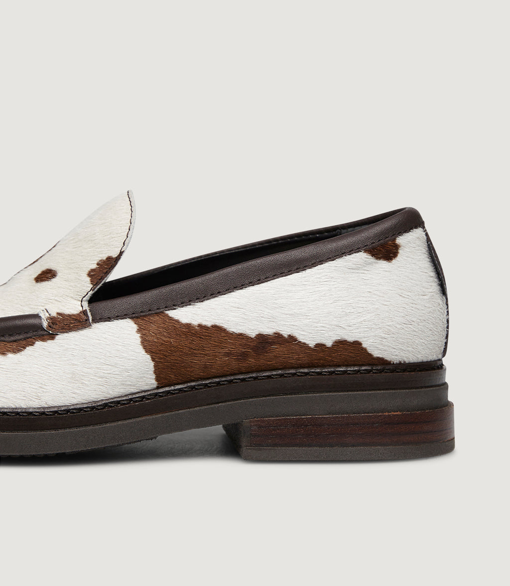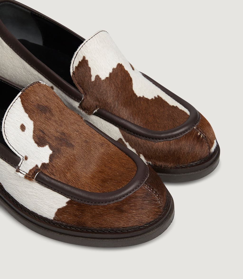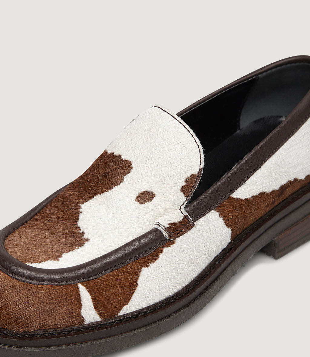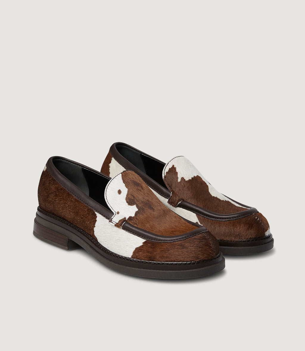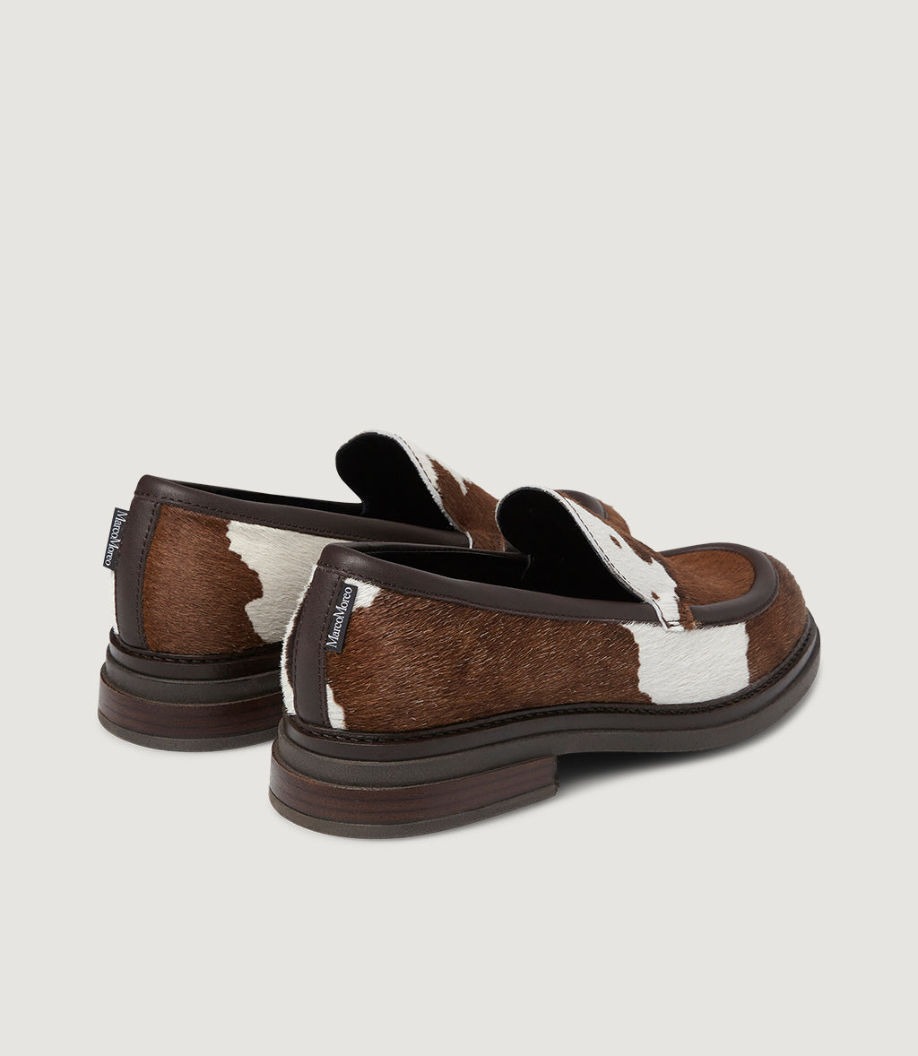 Dakota is our statement loafer in hair-on calf leather with a bold brown-and-white cow print. Smooth leather piping frames the apron toe for a clean, sculpted silhouette. The lightweight raised sole gives easy, all-day comfort, while the slip-on construction keeps it effortless. Tactile, graphic and surprisingly versatile—Dakota elevates denim, tailoring and dresses the unmistakably Marco Moreo.