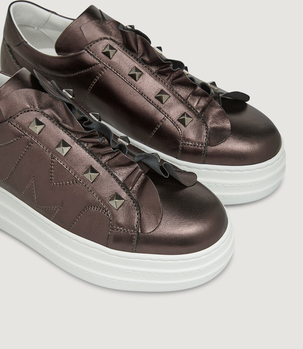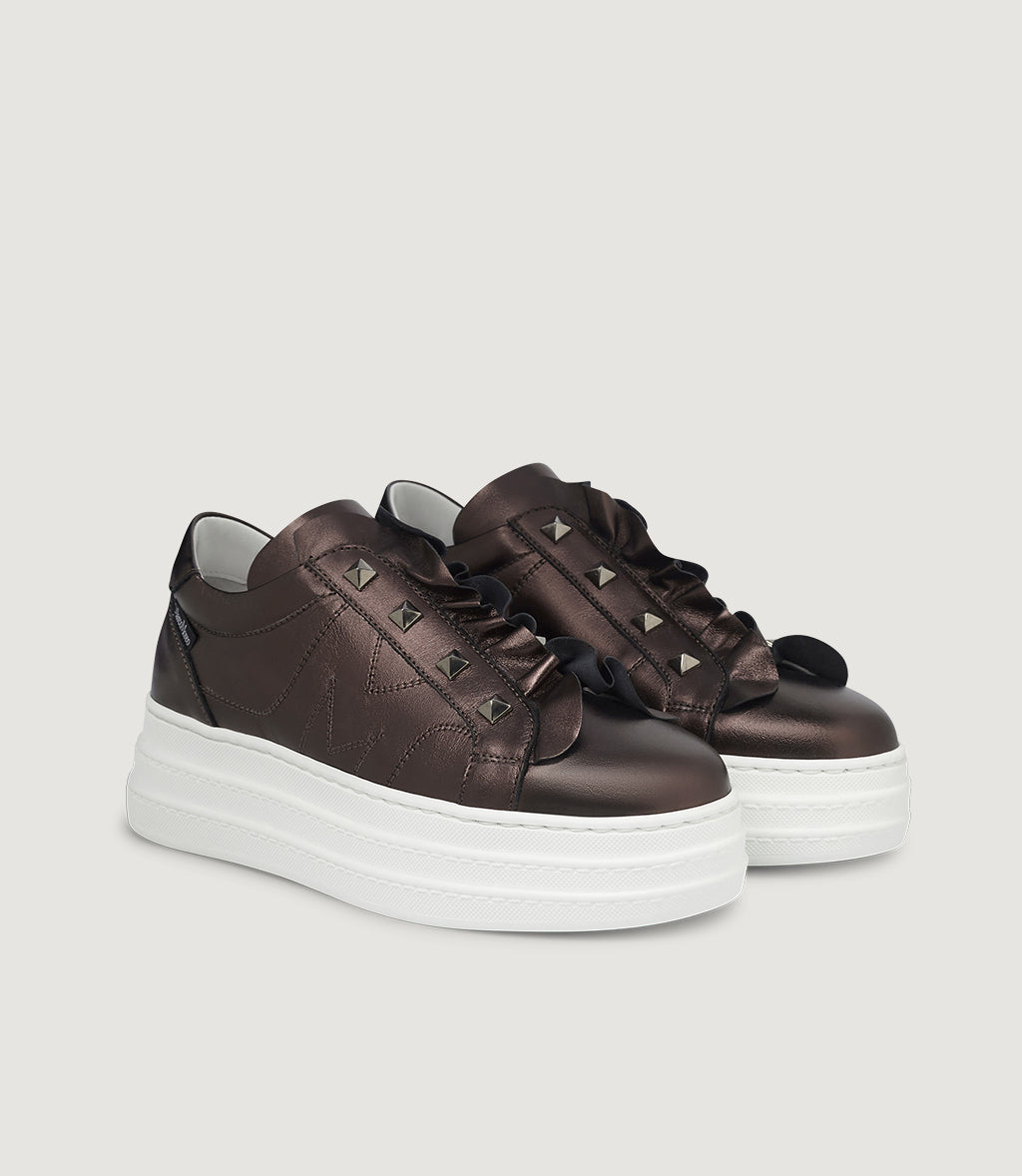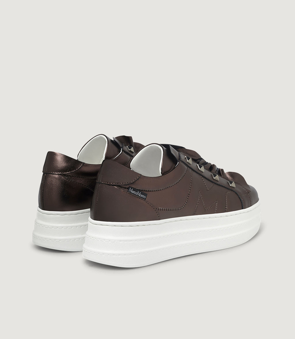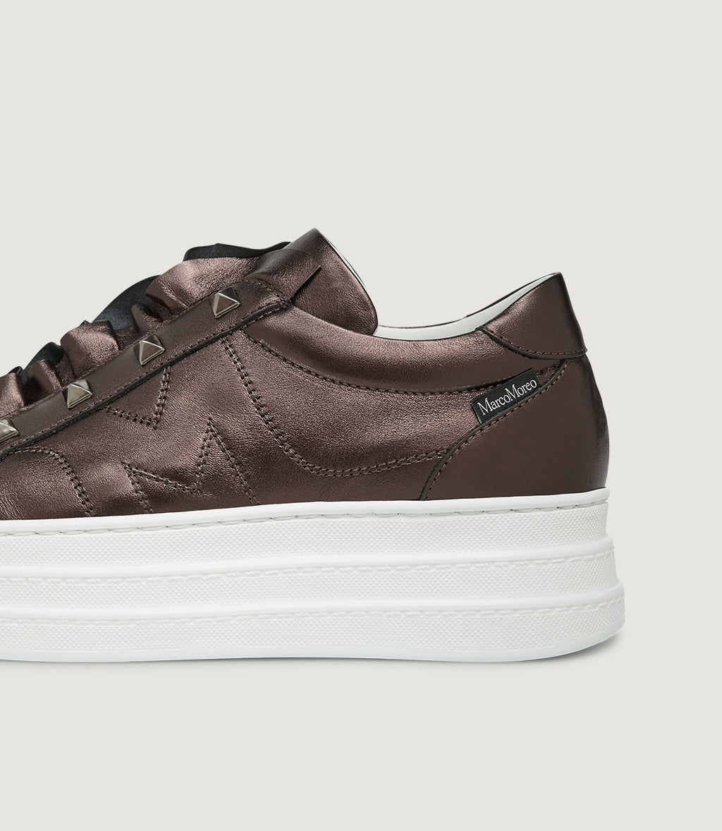 Whitney is the glam-luxe sneaker with a rock-chic twist. Crafted in luminous metallic leather in Moro (a deep bronze), it showcases a soft ruffled tongue topped with a row of pyramid studs. The stitched side “M” signs it off, while our signature extra-light platform adds effortless height and all-day comfort. Pair it with denim or tailoring—Whitney does the talking.With its blend of materials, textures, details and inspiration, Whitney is the most multifaceted sneaker of the new exclusive Collection – the first of its kind – that Marco has dedicated to this specific model: the MRC 57 capsule.