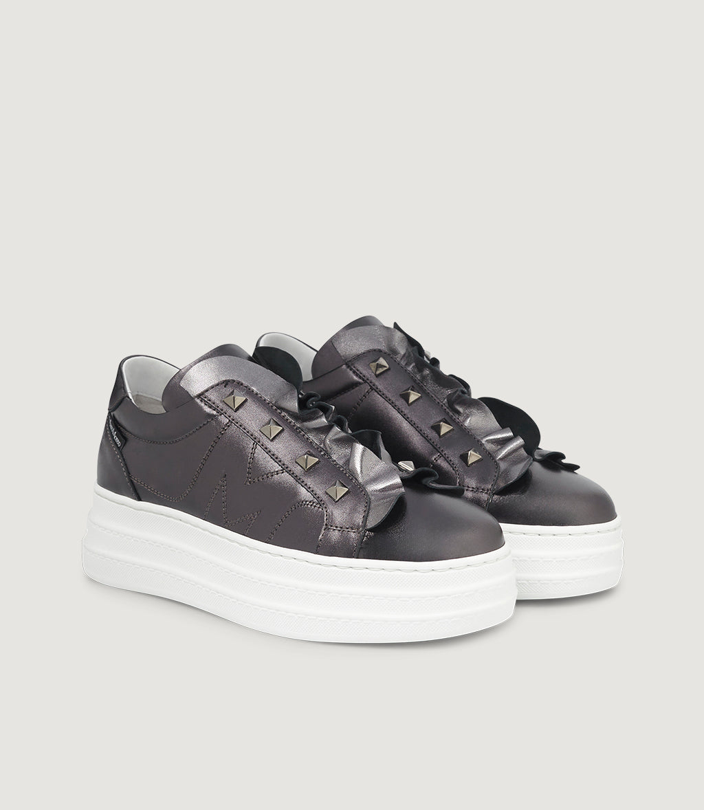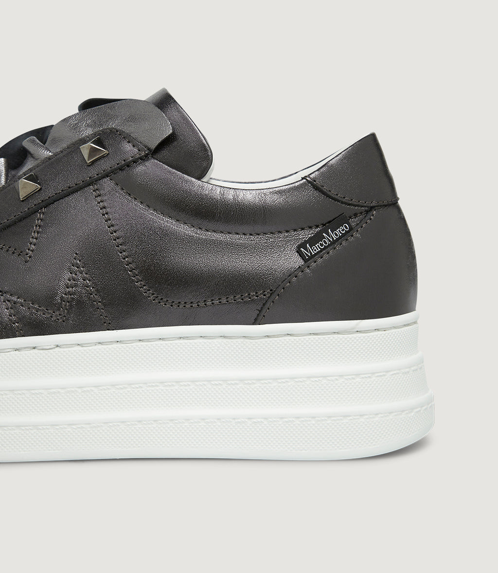 Whitney is our statement platform sneaker in metallic anthracite. The upper is traced by the signature stitched “M”, while a soft ruffle ripples over the tongue and a studded strap adds a rock-chic touch. Set on Marco’s ultra-light, height-boosting platform sole, it delivers cushioned comfort from morning to night. Everyday glamour, unmistakably Marco Moreo.Whitney does the talking.With its blend of materials, textures, details and inspiration, Whitney is the most multifaceted sneaker of the new exclusive Collection – the first of its kind – that Marco has dedicated to this specific model: the MRC 57 capsule.