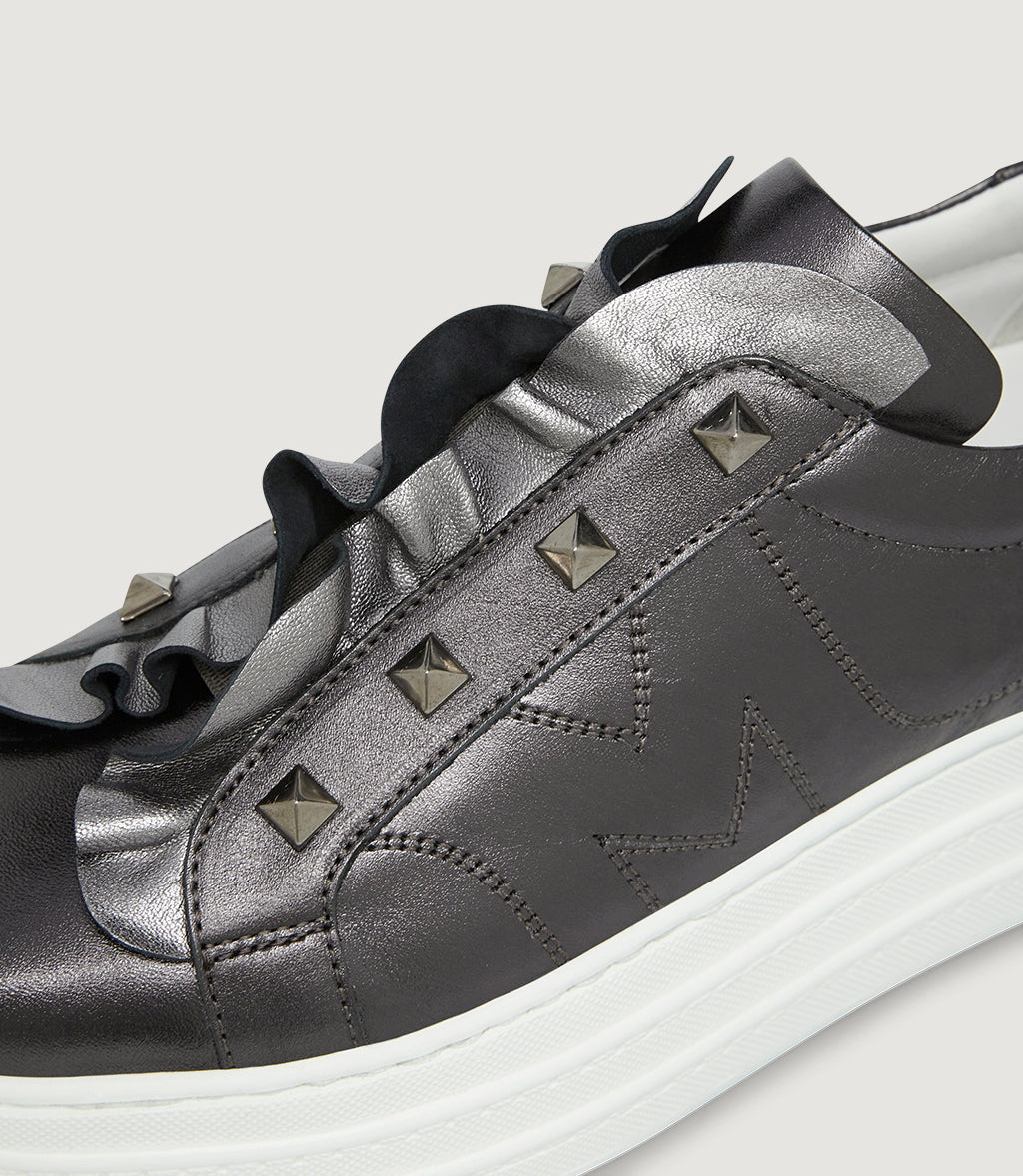 • Metallic leather ruffle beside the tongue, framed by row, square, three-dimensional studs.