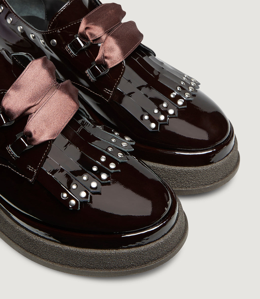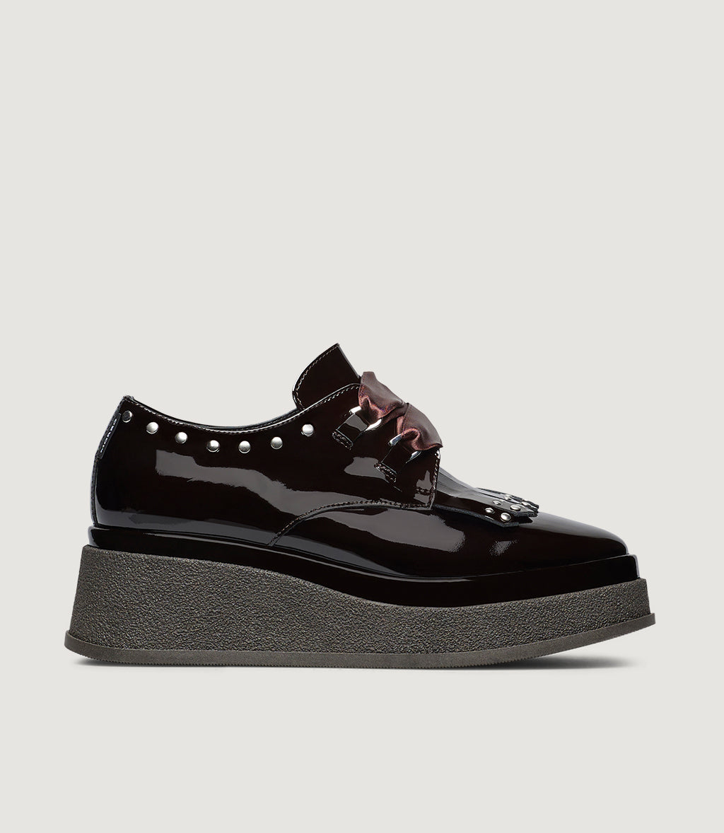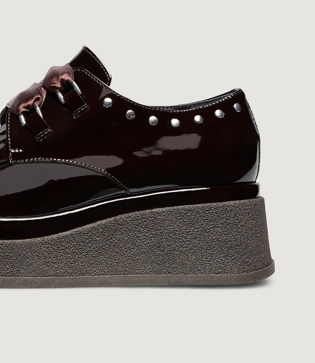 Already part of our collections for two seasons now, April stars again in the AW 25/26 season, this time even richer in details. She’s dressed for the occasion in shiny patent leather (in two versions: black or burgundy) , Bold with a playful edge. This glossy Bordeaux patent flatform reimagines the classic derby with satin ribbon laces, a studded kiltie and micro-studs tracing the collar. The sculpted, ultra-light platform adds height without the heaviness, keeping every step comfortable.