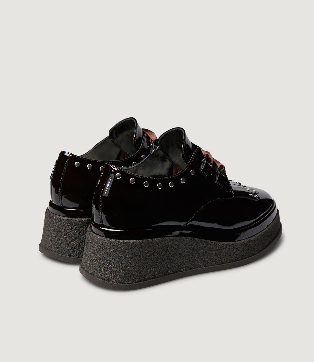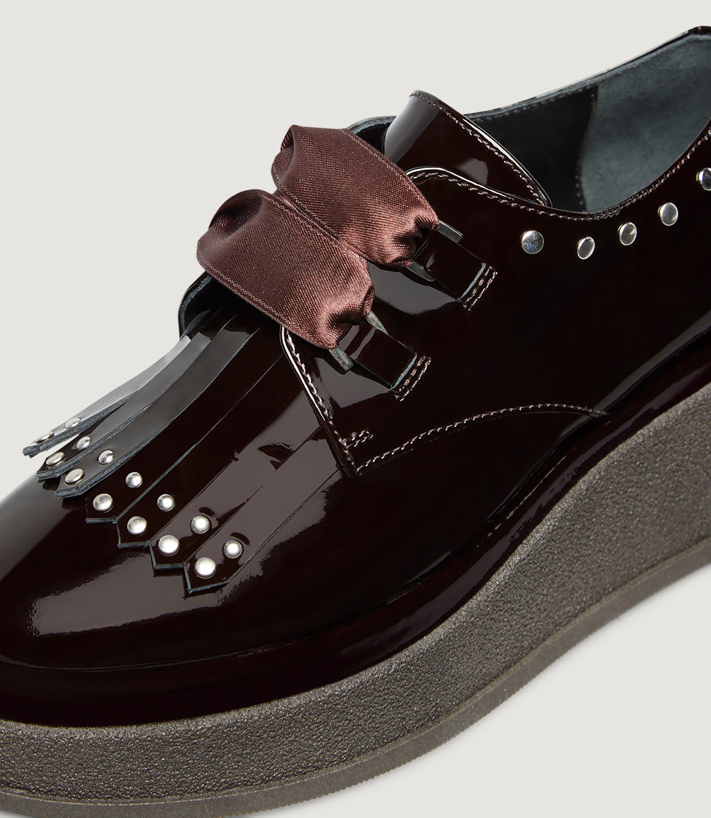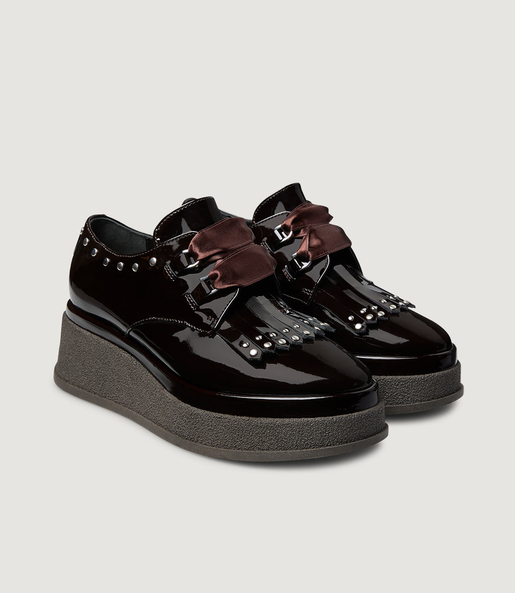 Already part of our collections for two seasons now, April stars again in the AW 25/26 season, this time even richer in details. She’s dressed for the occasion in shiny patent leather (in two versions: black or burgundy) , Bold with a playful edge. This glossy Bordeaux patent flatform reimagines the classic derby with satin ribbon laces, a studded kiltie and micro-studs tracing the collar. The sculpted, ultra-light platform adds height without the heaviness, keeping every step comfortable.