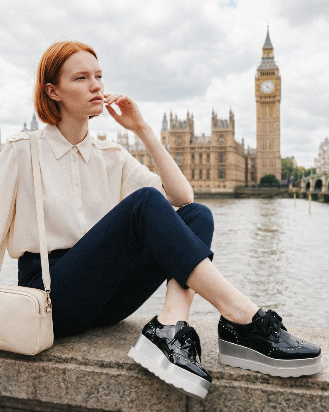 Set on a statement platform sole, the design features a contrasting metallic-effect midsole paired with a sturdy outsole for stability and comfort. The lace-up closure ensures an adjustable fit, making this shoe both practical and fashion-forward.