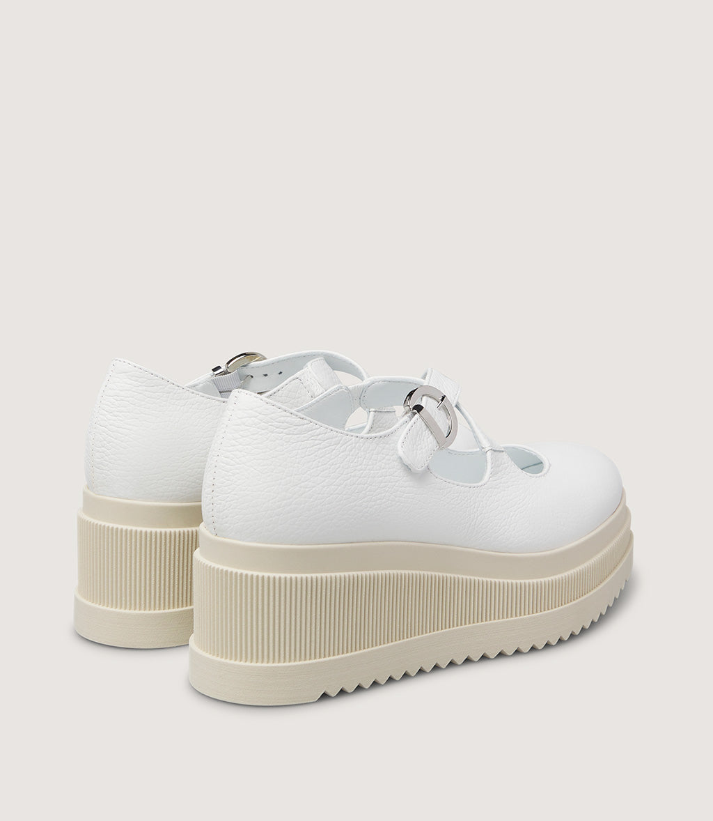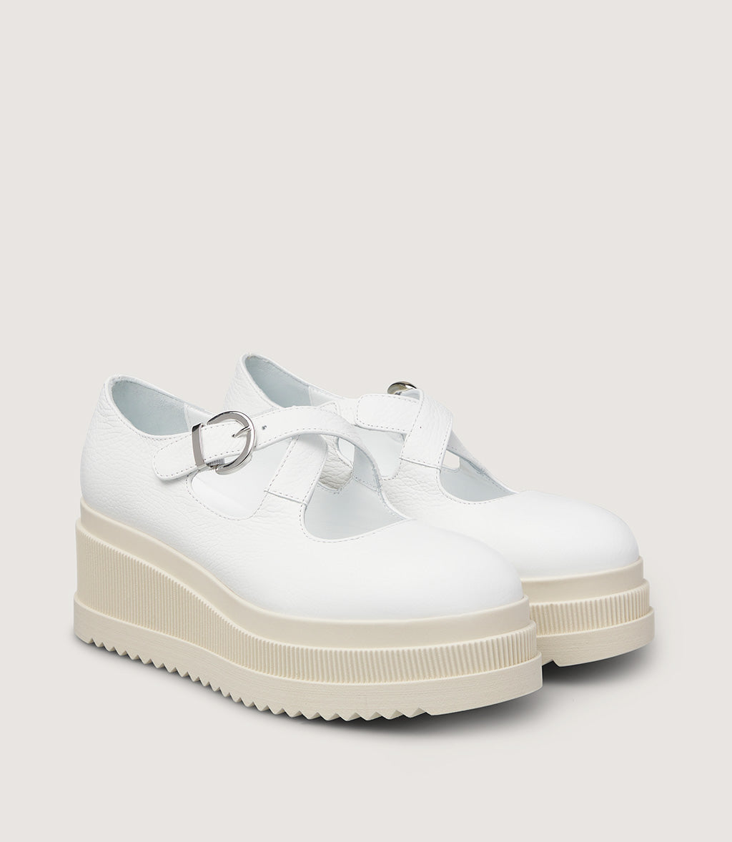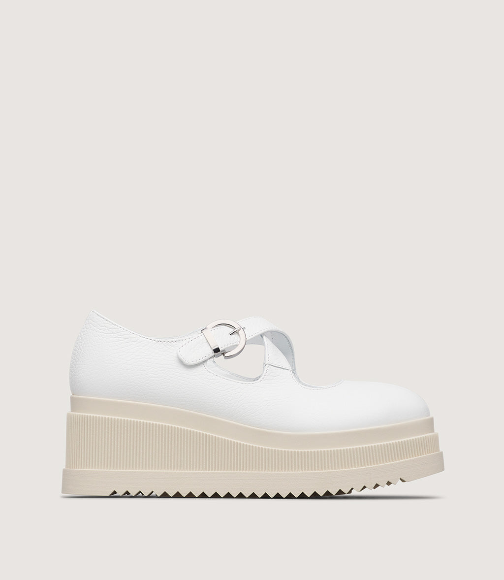 This modern Mary Jane shoe is crafted from smooth white leather, offering a fresh and contemporary look. The classic strap across the instep is updated with a sleek metal buckle, combining timeless style with a modern edge.