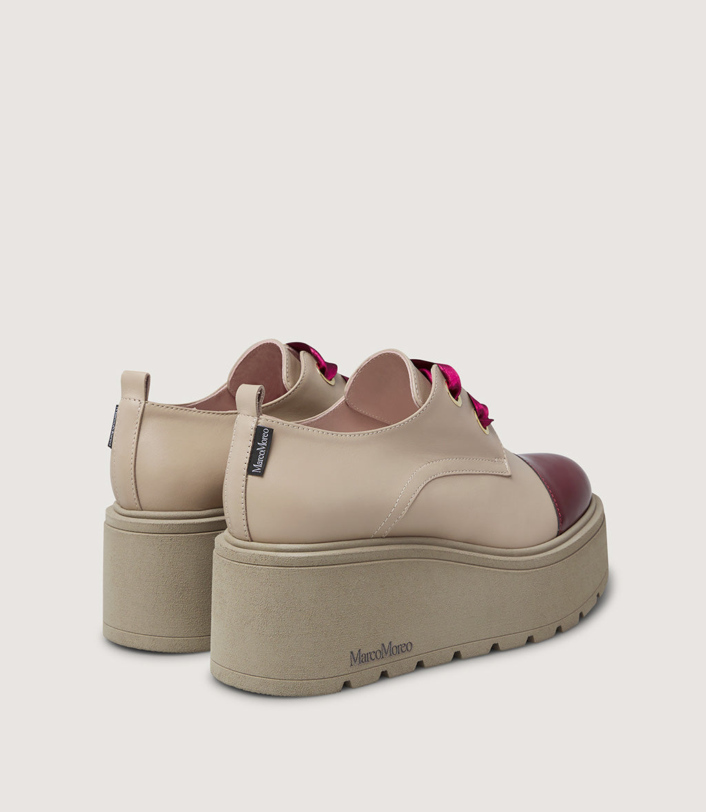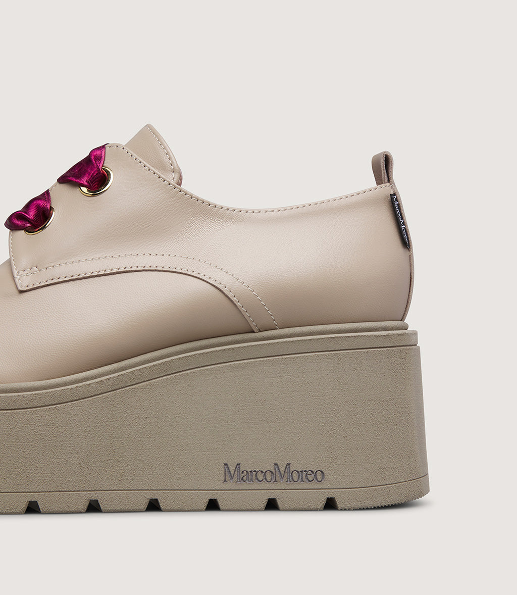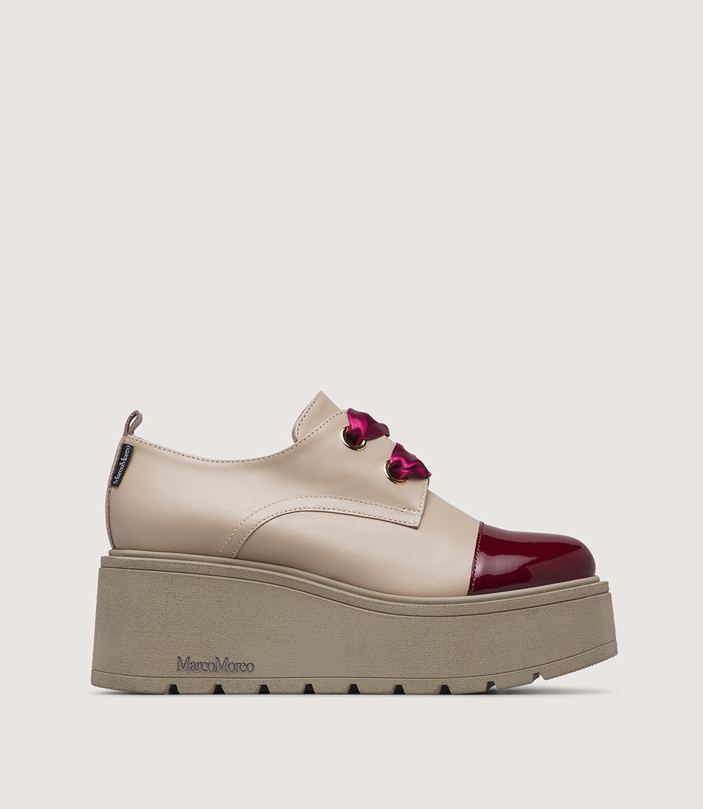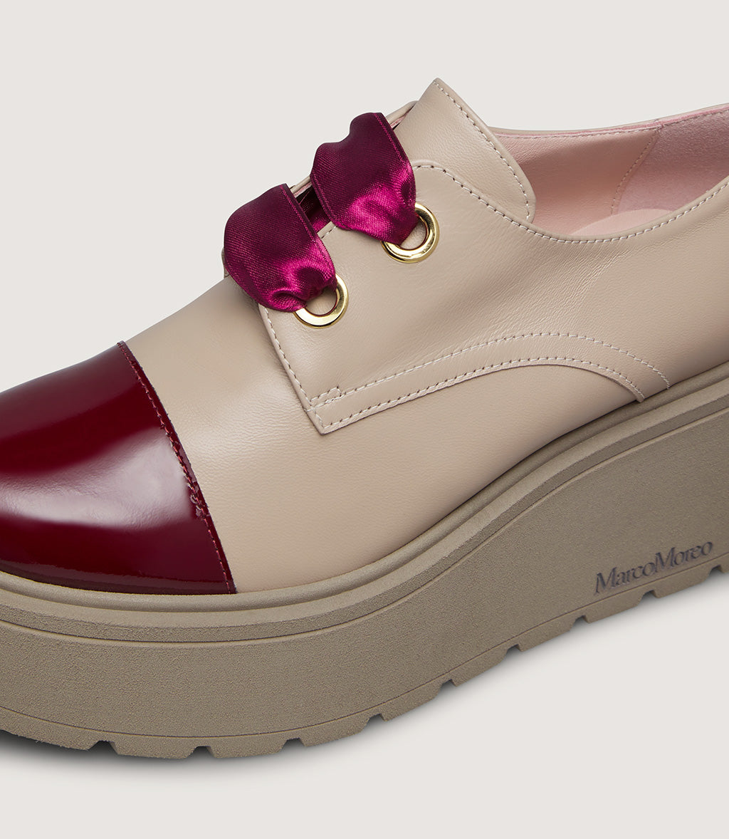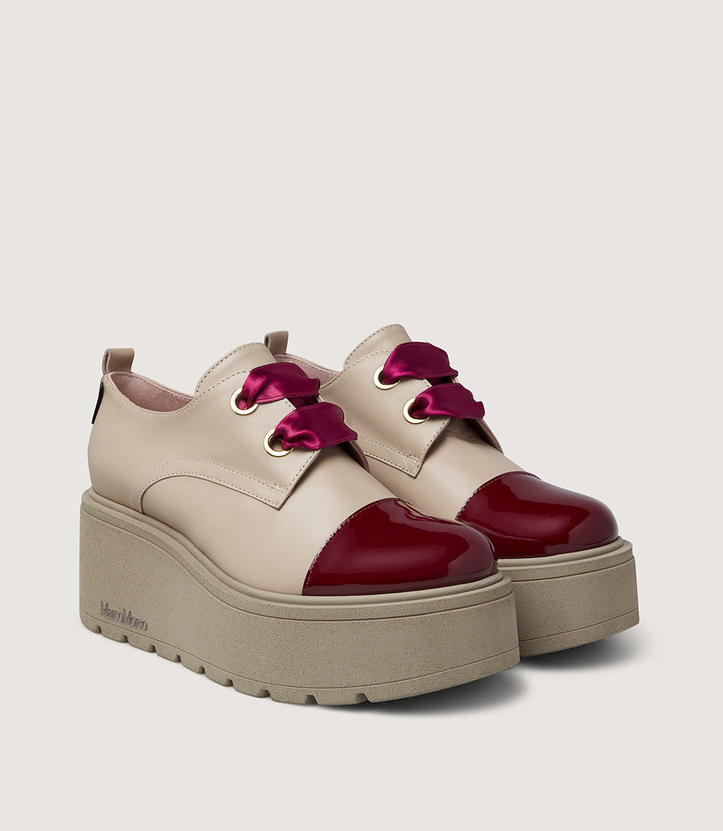 Alison is one of Marco Moreo’s classic models. She’s a lace-up with satin ribbons that brings playful textural and chromatic contrasts to every collection. She’s back in a two-tone style with two versions: one (classic) in beige nappa leather with a black patent leather toe, and another in beige nappa leather with a burgundy patent leather toe. Both share a high taupe sole in matte rubber with a tone-on-tone printed brand logo.