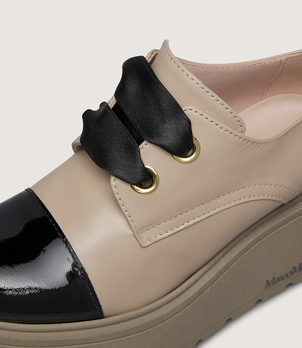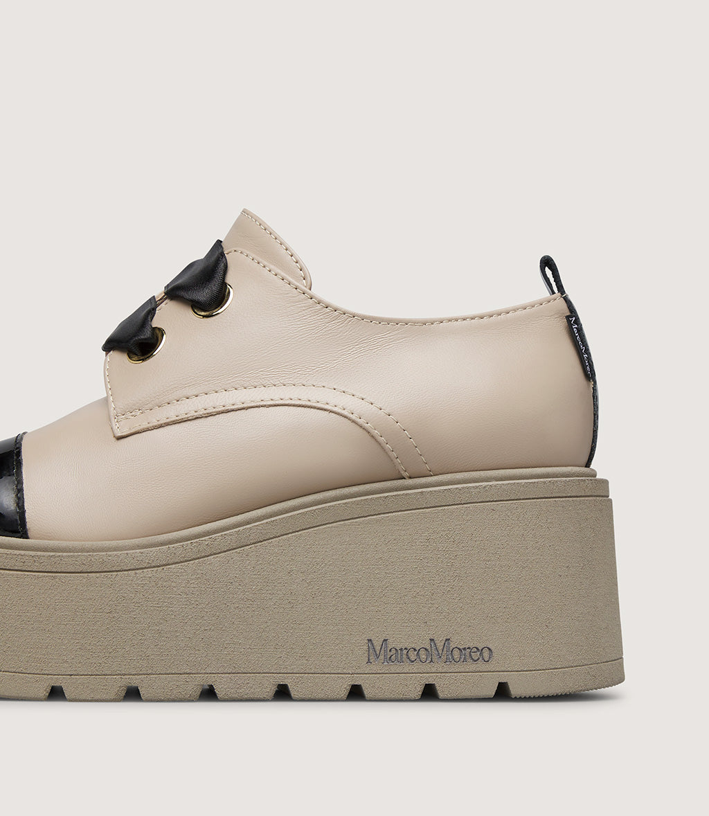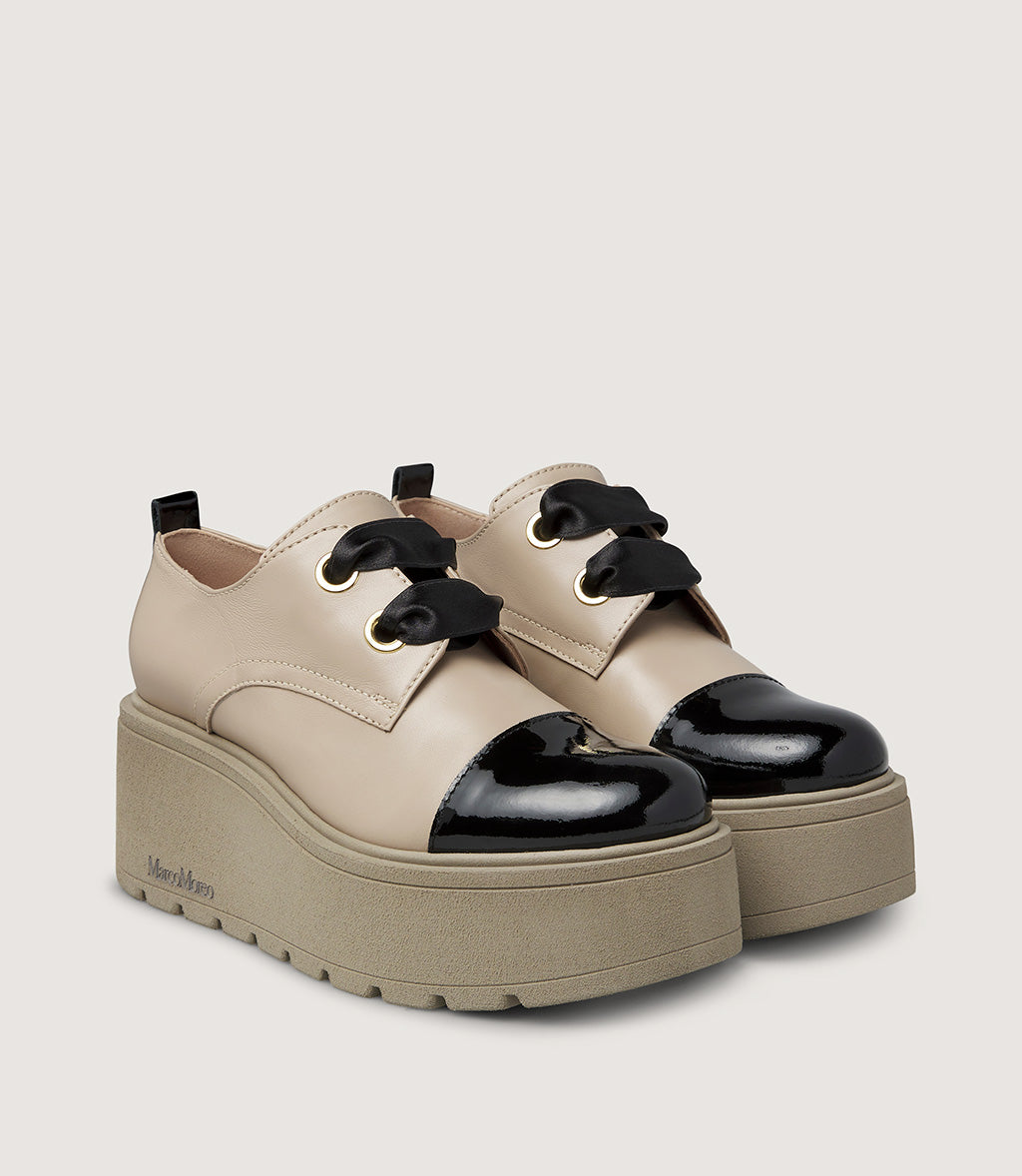 Alison is one of Marco Moreo’s classic models. She’s a lace-up with satin ribbons that brings playful textural and chromatic contrasts to every collection. She’s back in a two-tone style with two versions: one (classic) in beige nappa leather with a black patent leather toe, and another in beige nappa leather with a burgundy patent leather toe. Both share a high taupe sole in matte rubber with a tone-on-tone printed brand logo.
