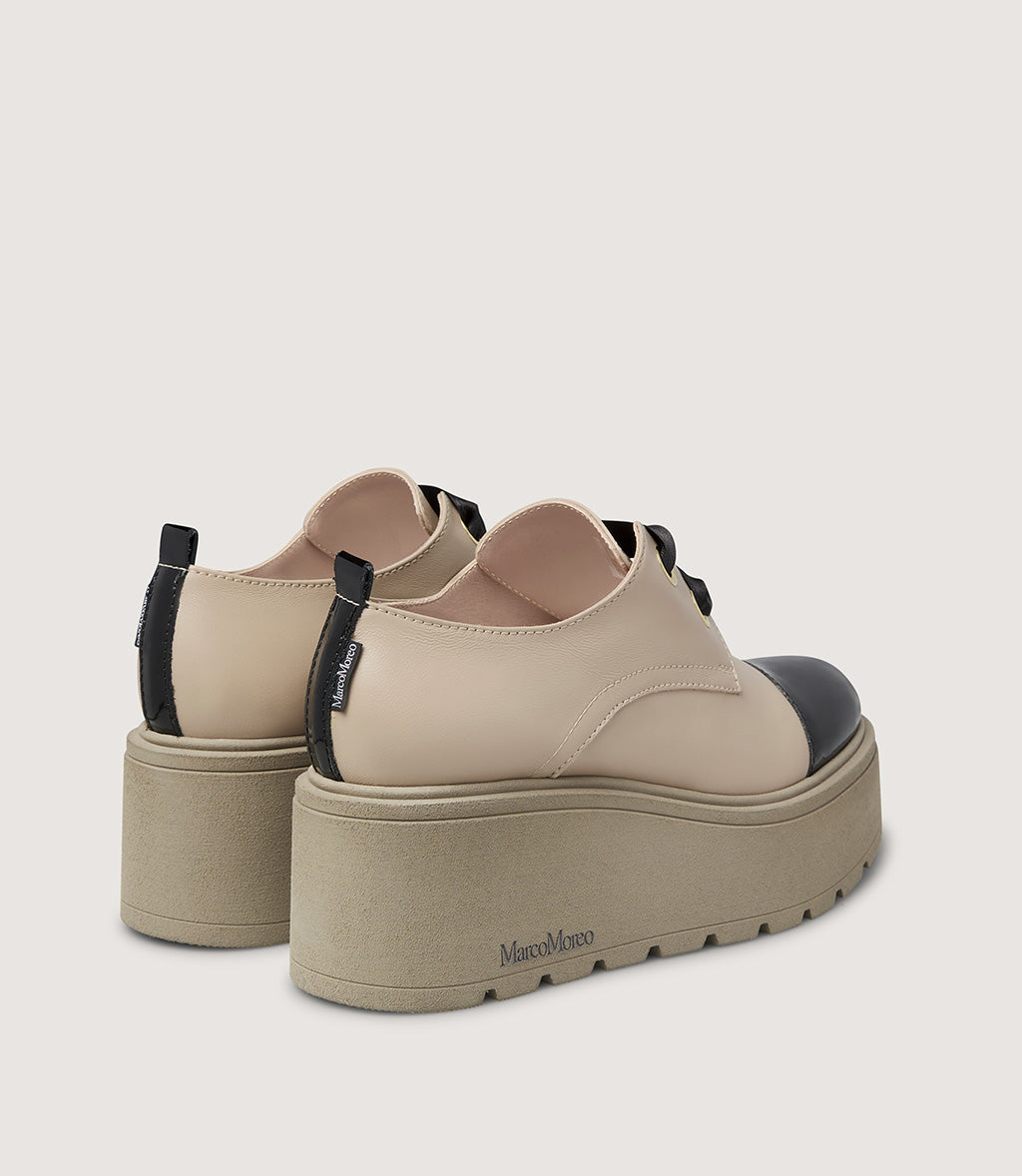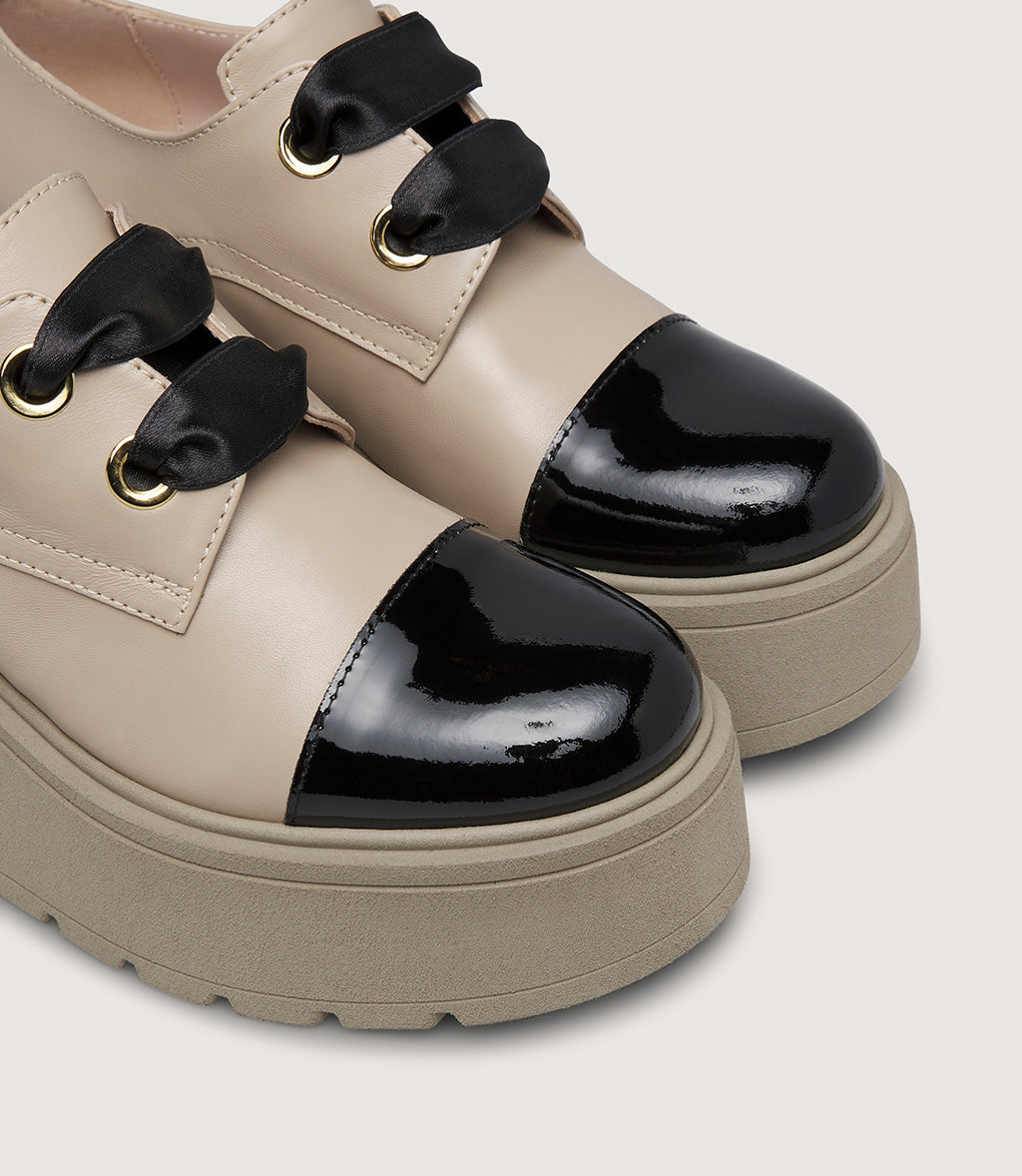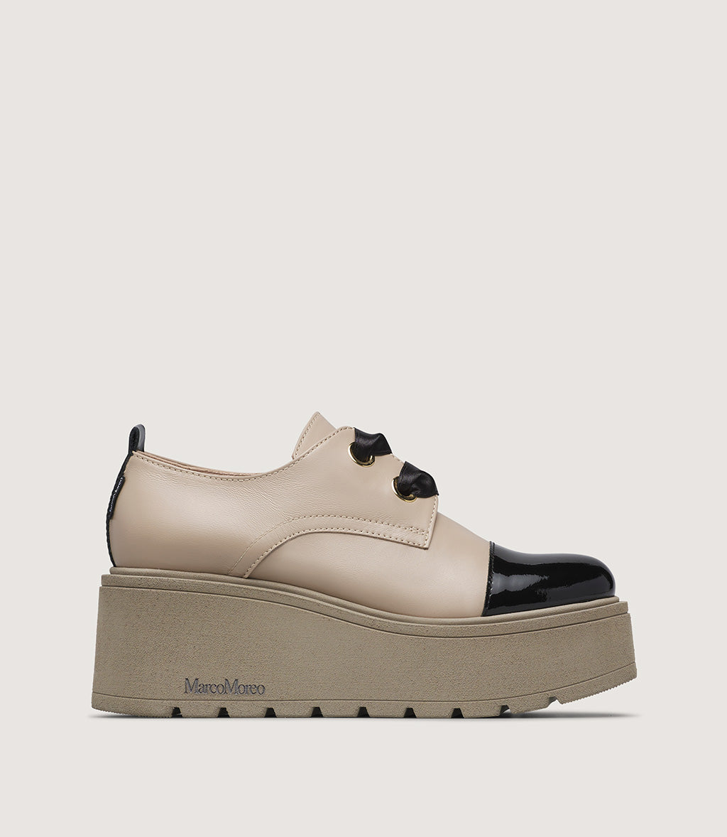 Alison is one of Marco Moreo’s classic models. She’s a lace-up with satin ribbons that brings playful textural and chromatic contrasts to every collection. She’s back in a two-tone style with two versions: one (classic) in beige nappa leather with a black patent leather toe, and another in beige nappa leather with a burgundy patent leather toe. Both share a high taupe sole in matte rubber with a tone-on-tone printed brand logo.