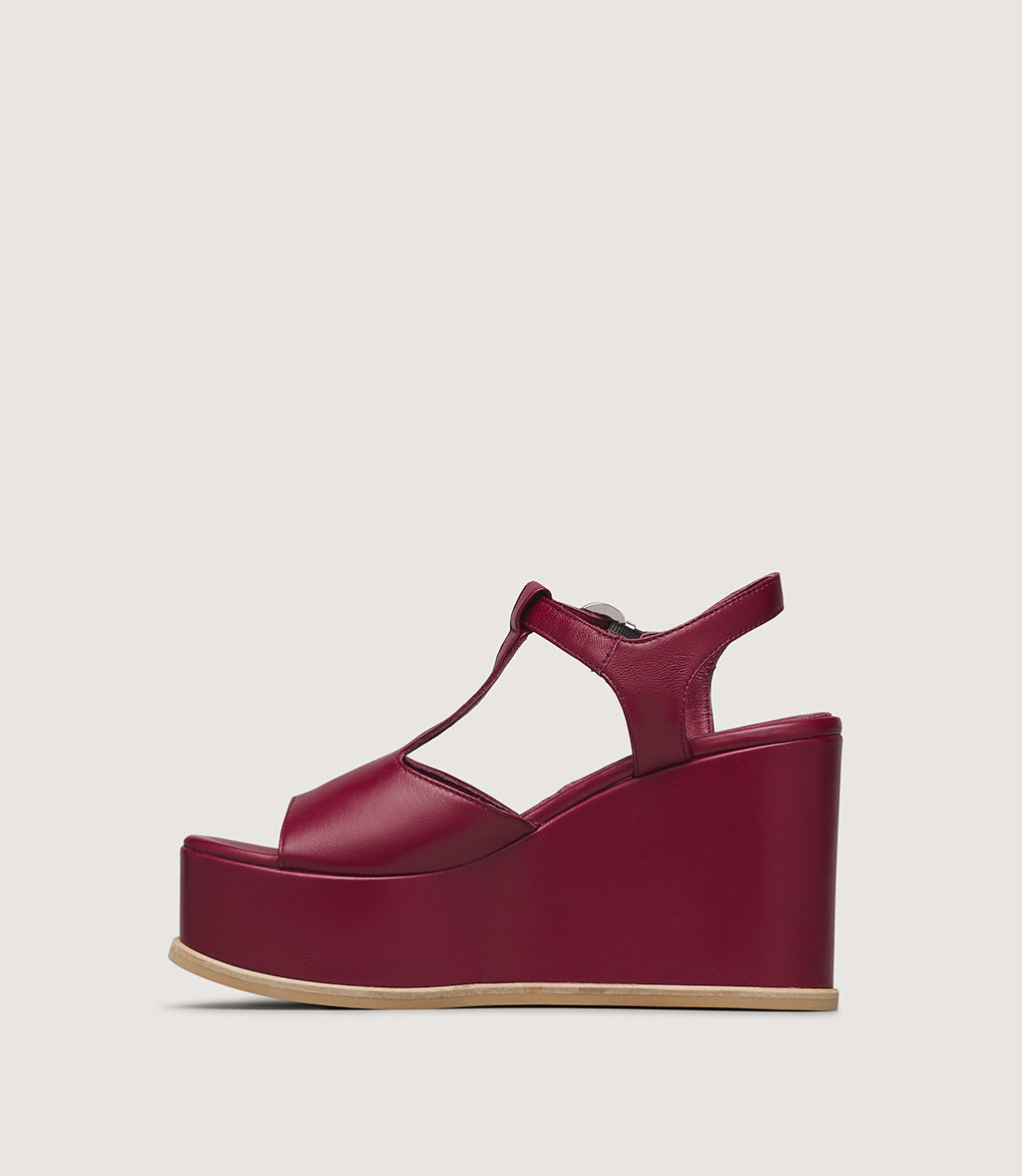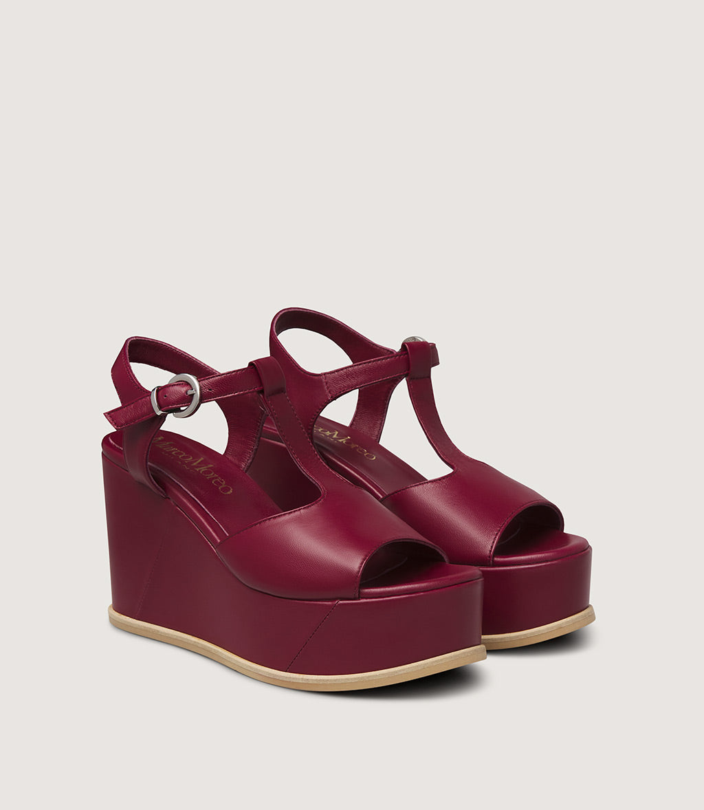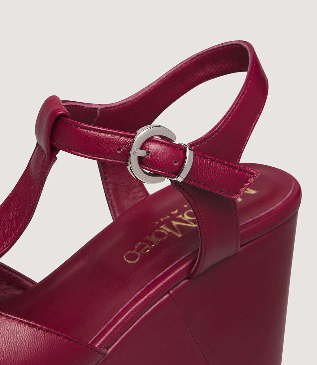 Bold yet elegant, this platform wedge sandal is designed to make a confident style statement. Crafted from smooth burgundy leather, it features a sleek upper with a T-strap silhouette and an adjustable ankle strap with a metal buckle for a secure, customized fit.