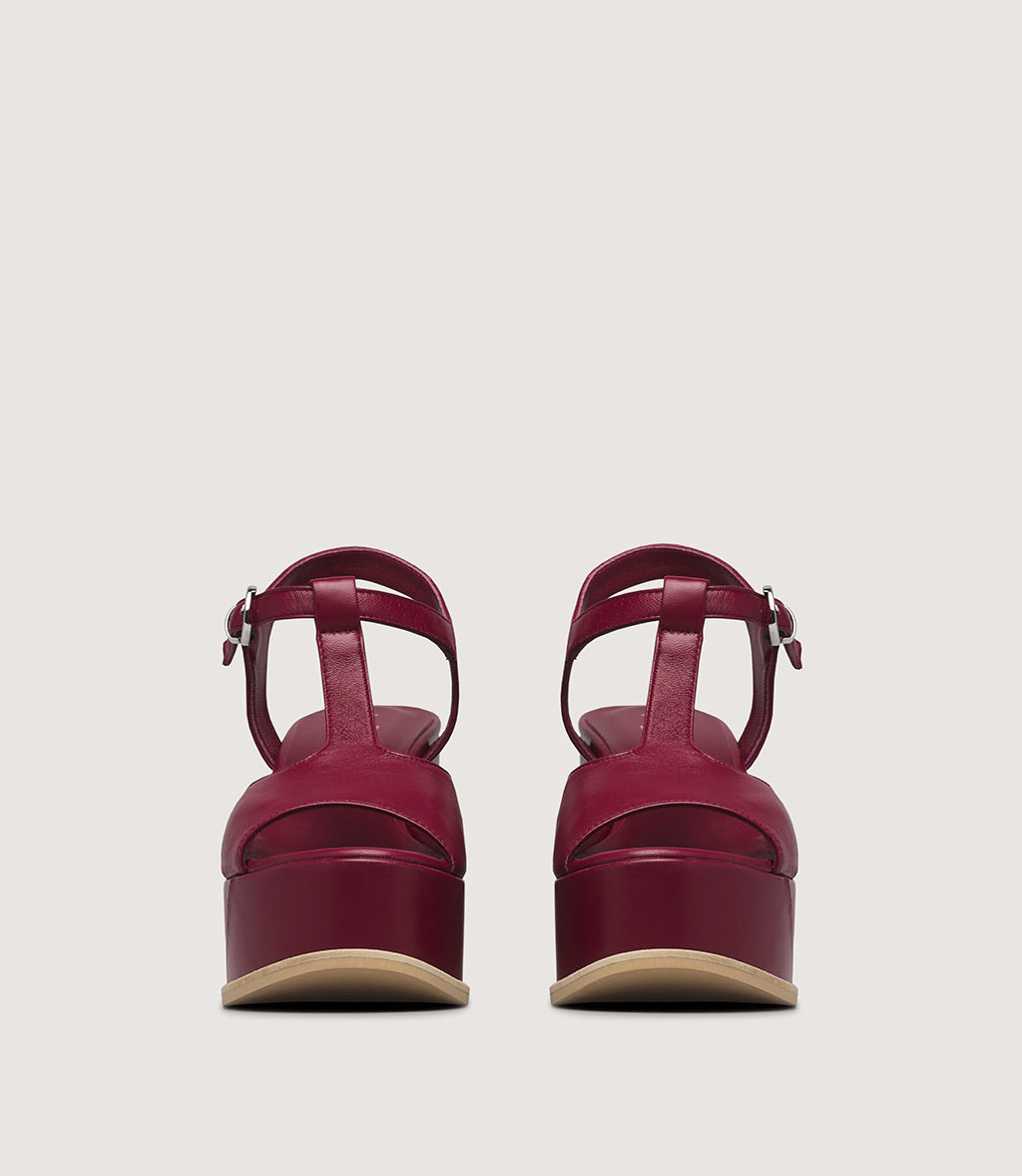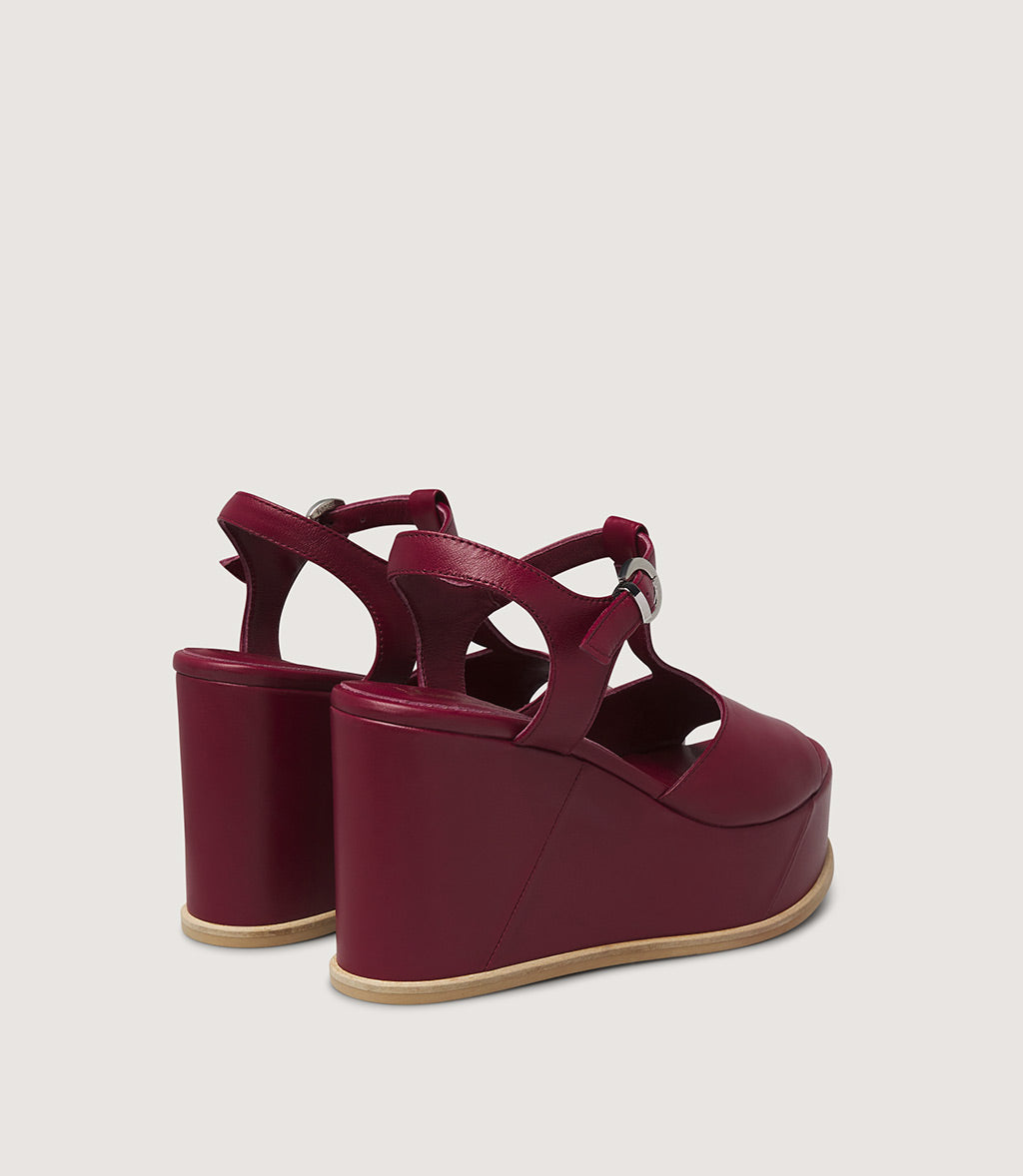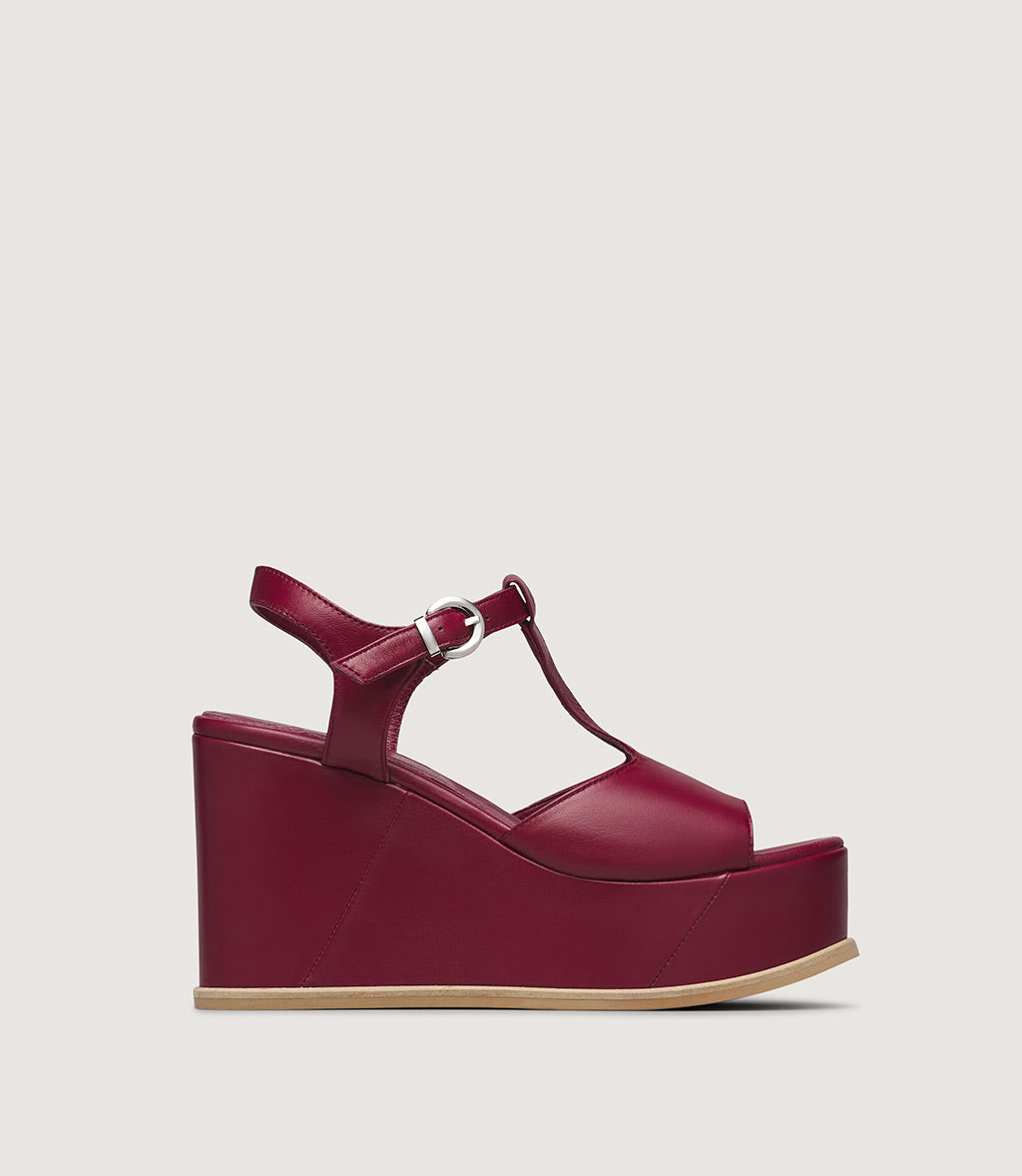 Bold yet elegant, this platform wedge sandal is designed to make a confident style statement. Crafted from smooth burgundy leather, it features a sleek upper with a T-strap silhouette and an adjustable ankle strap with a metal buckle for a secure, customized fit.