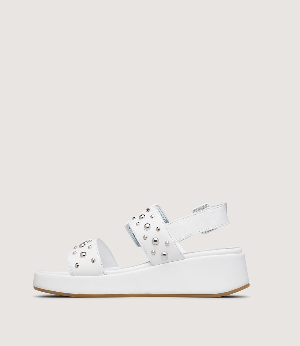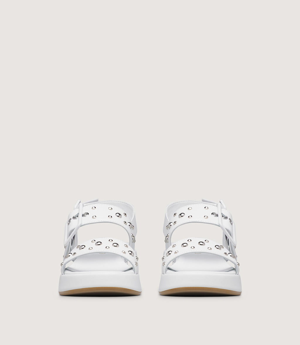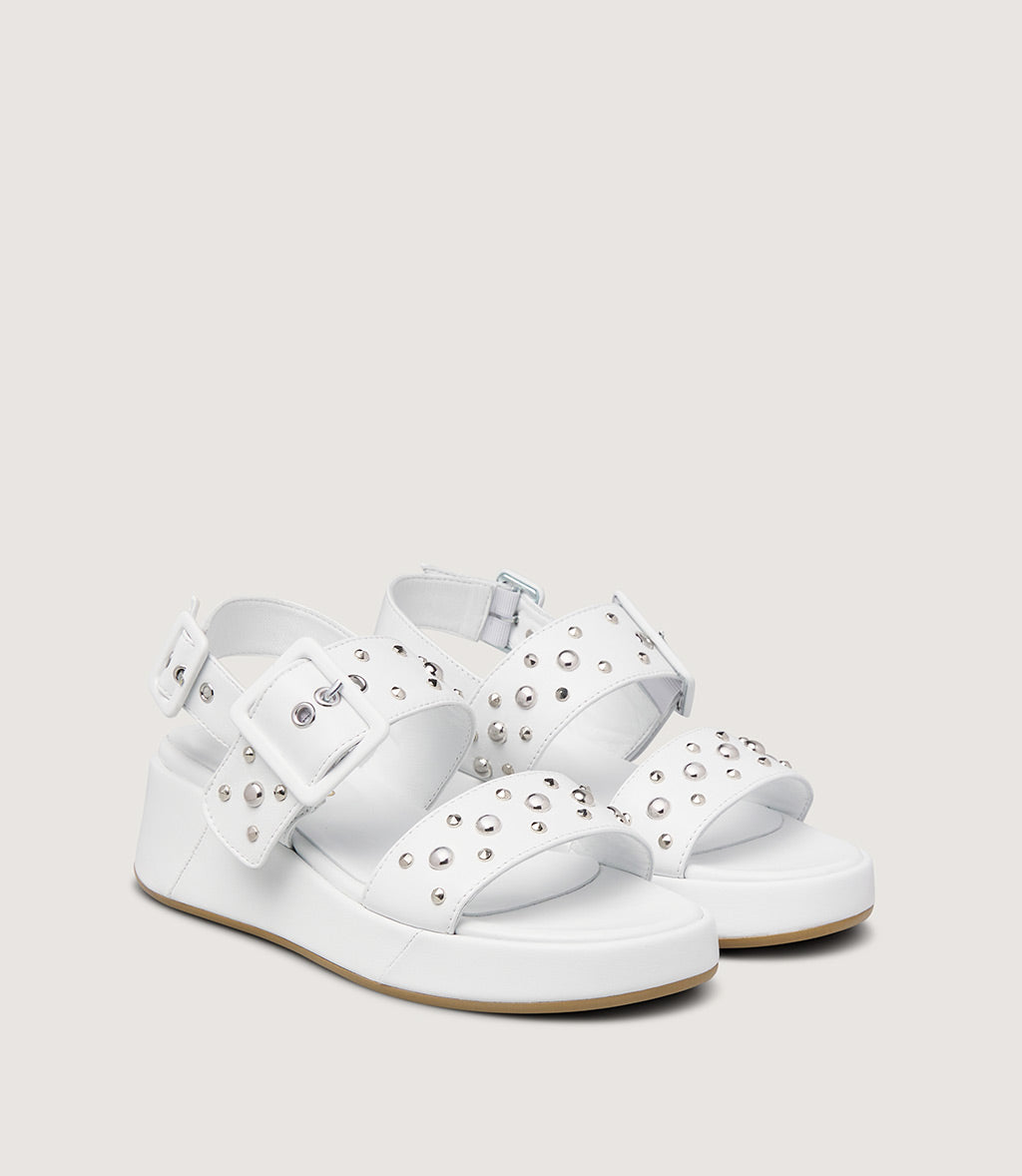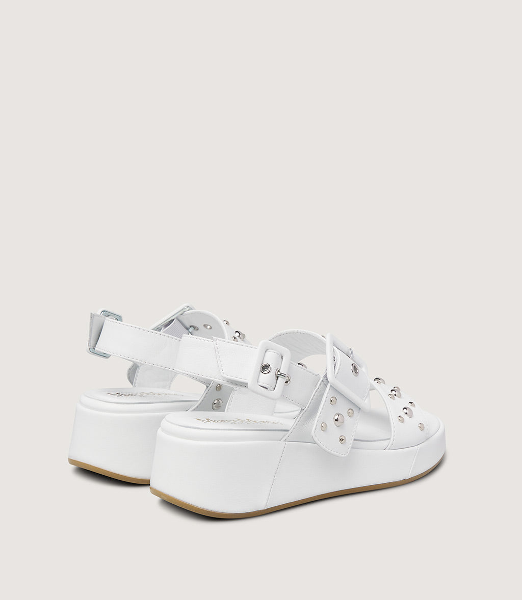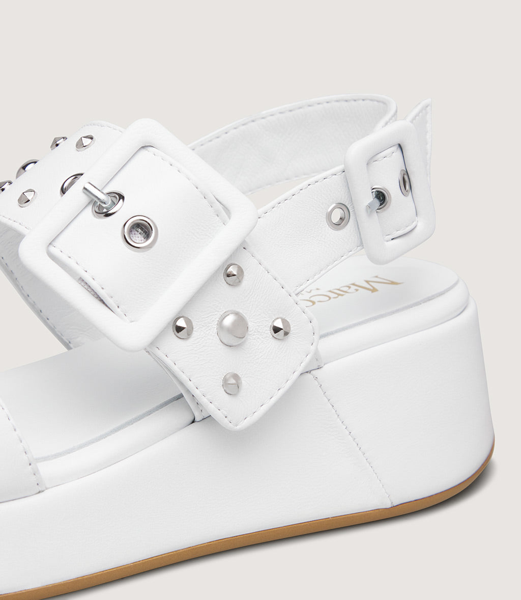 Bold and contemporary, this platform sandal is crafted from smooth leather in a white tone for a striking yet refined look. The wide front strap and adjustable ankle strap are embellished with metallic studs, adding a modern, edgy accent to the clean silhouette.