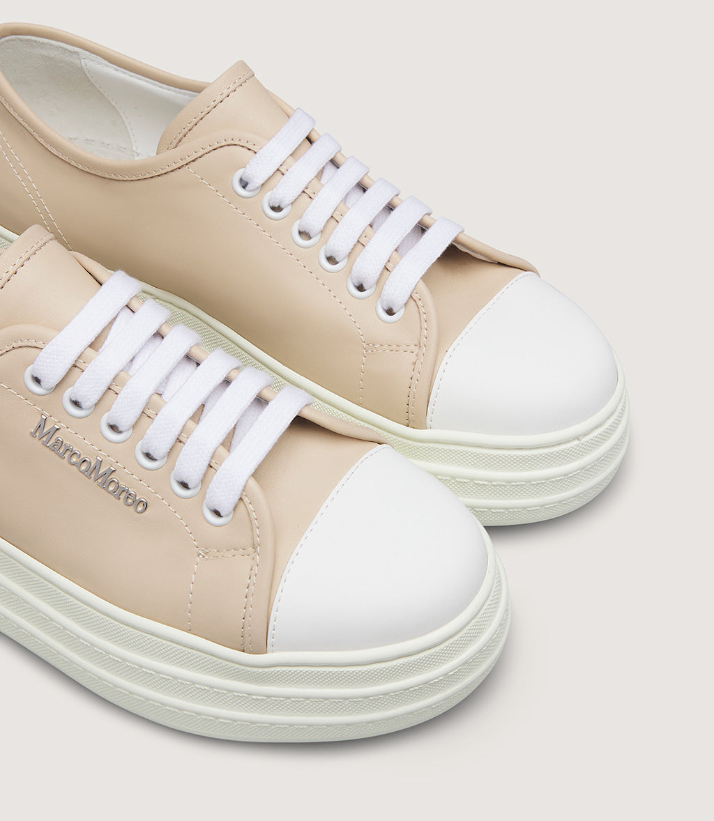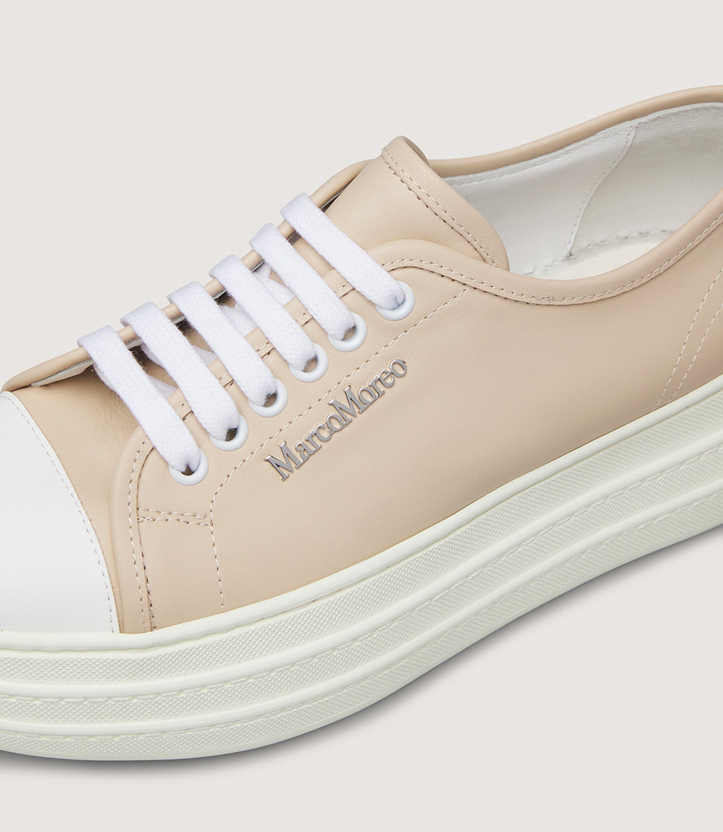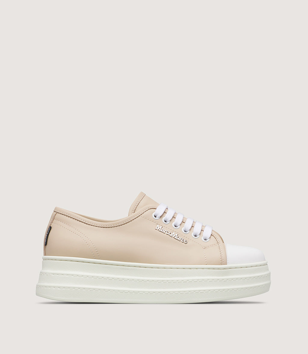 This modern platform sneaker blends minimalist design with everyday comfort. Crafted from smooth, premium leather in an elegant beige tone, it features a sleek low-top silhouette accented by crisp white laces and a classic rubber toe cap. The subtle logo detailing on the side adds a refined touch, while the chunky white platform sole delivers both style and support.
