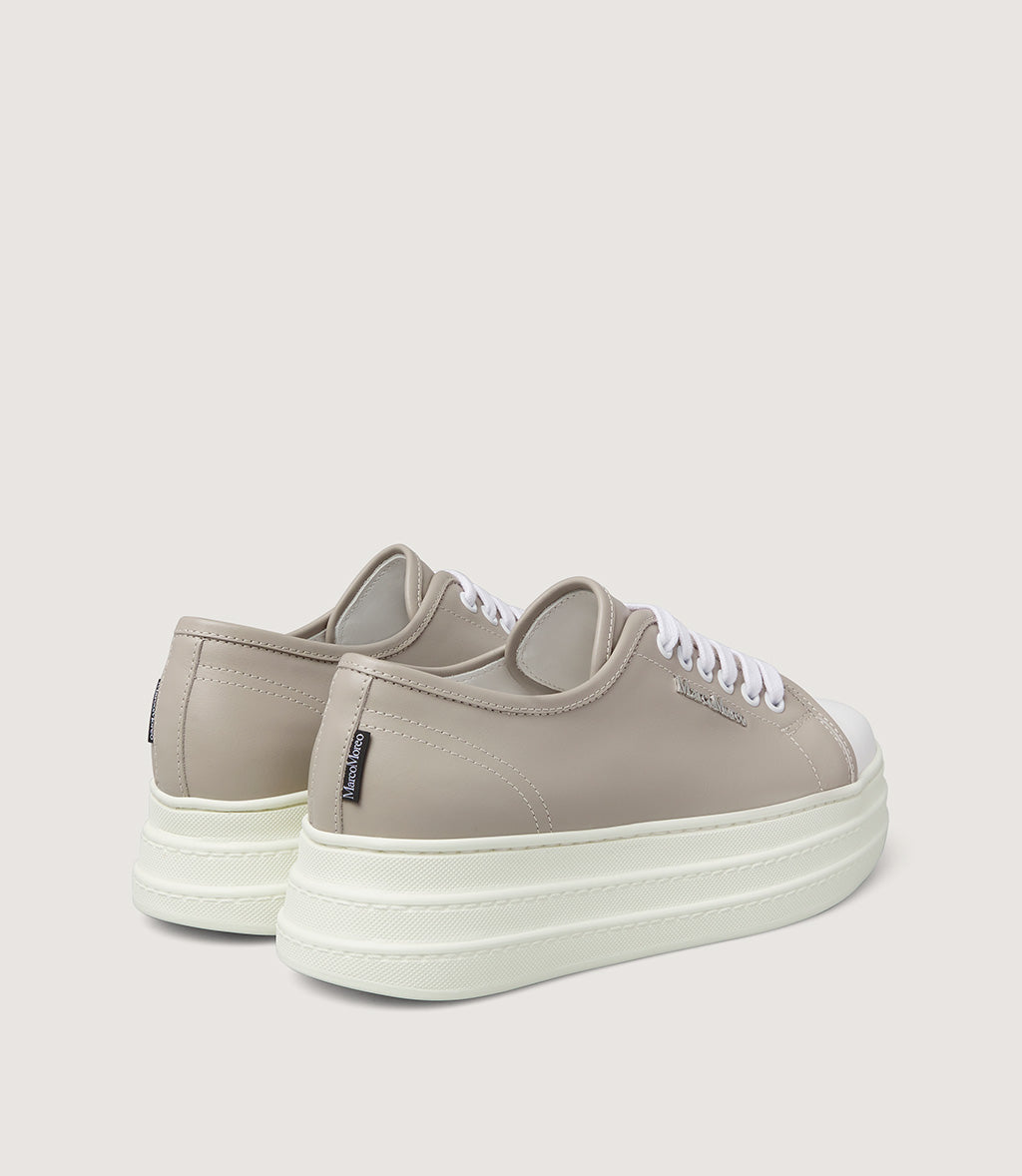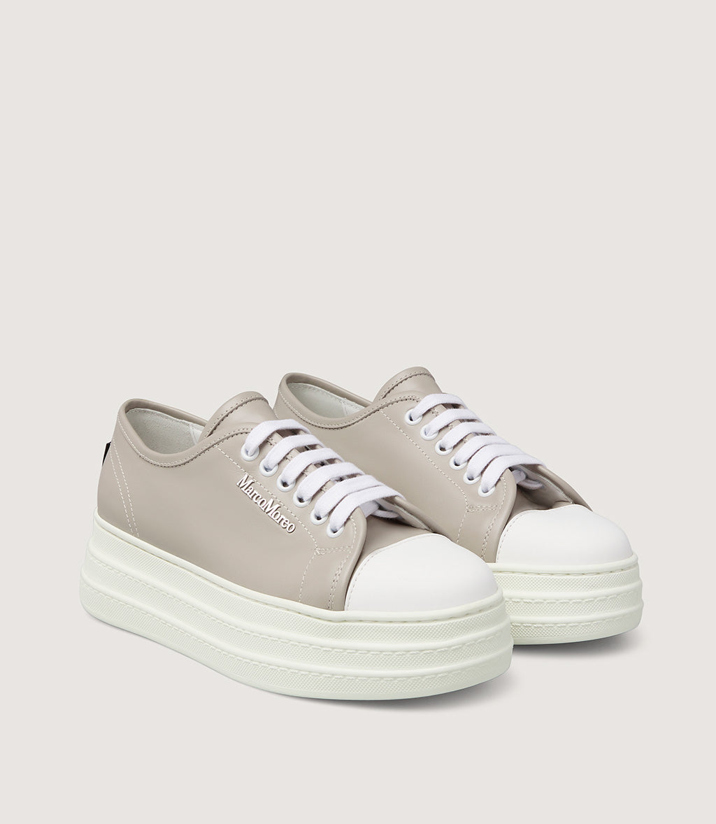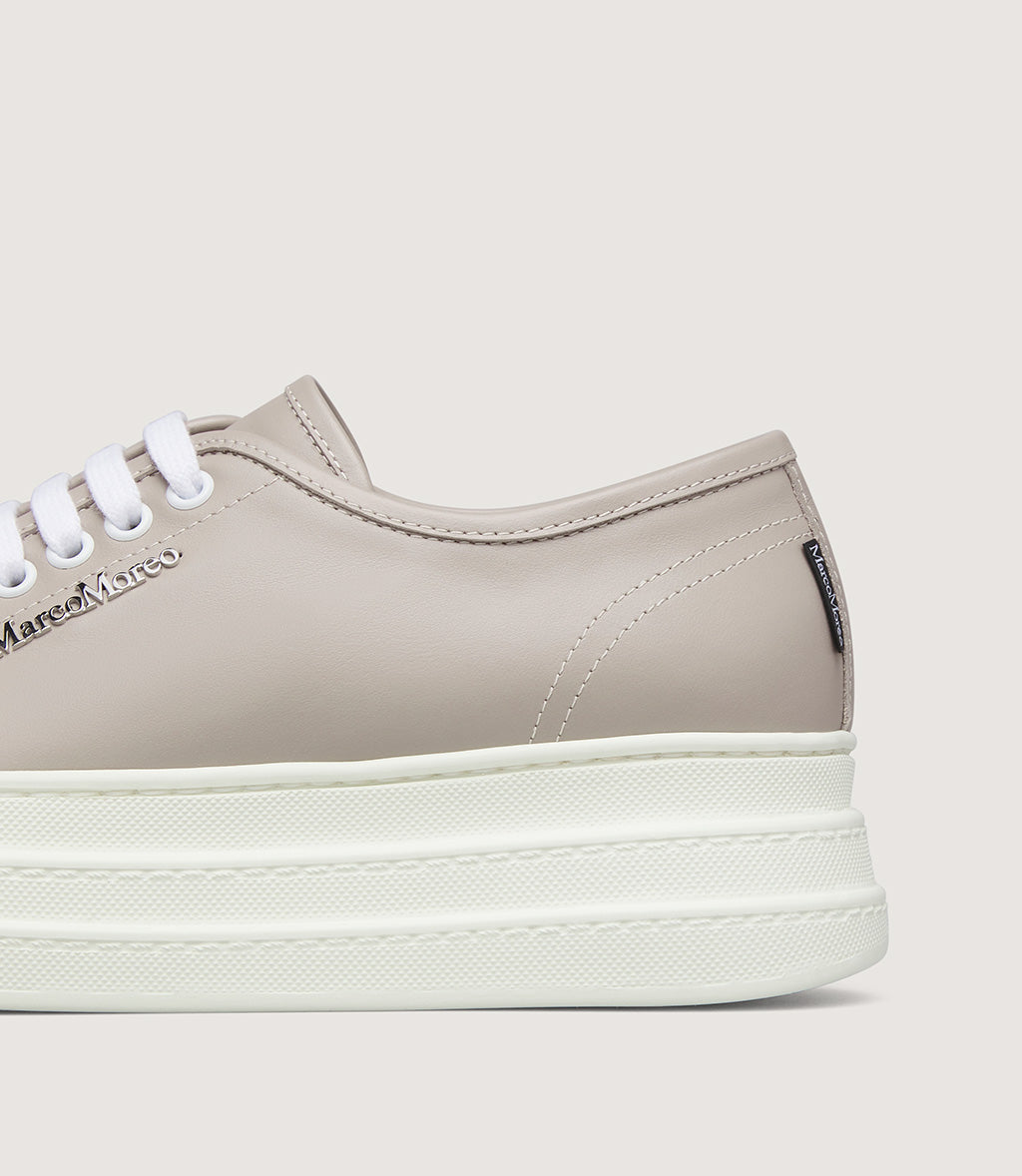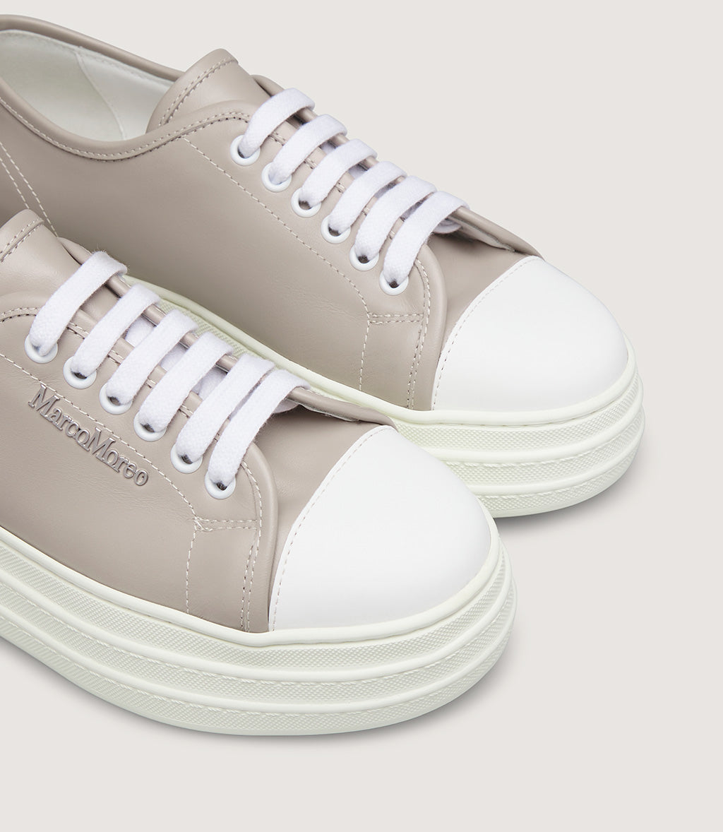 This modern platform sneaker blends minimalist design with everyday comfort. Crafted from smooth, premium leather in a taupe tone, it features a sleek low-top silhouette accented by crisp white laces and a classic rubber toe cap. The subtle logo detailing on the side adds a refined touch, while the chunky white platform sole delivers both style and support.