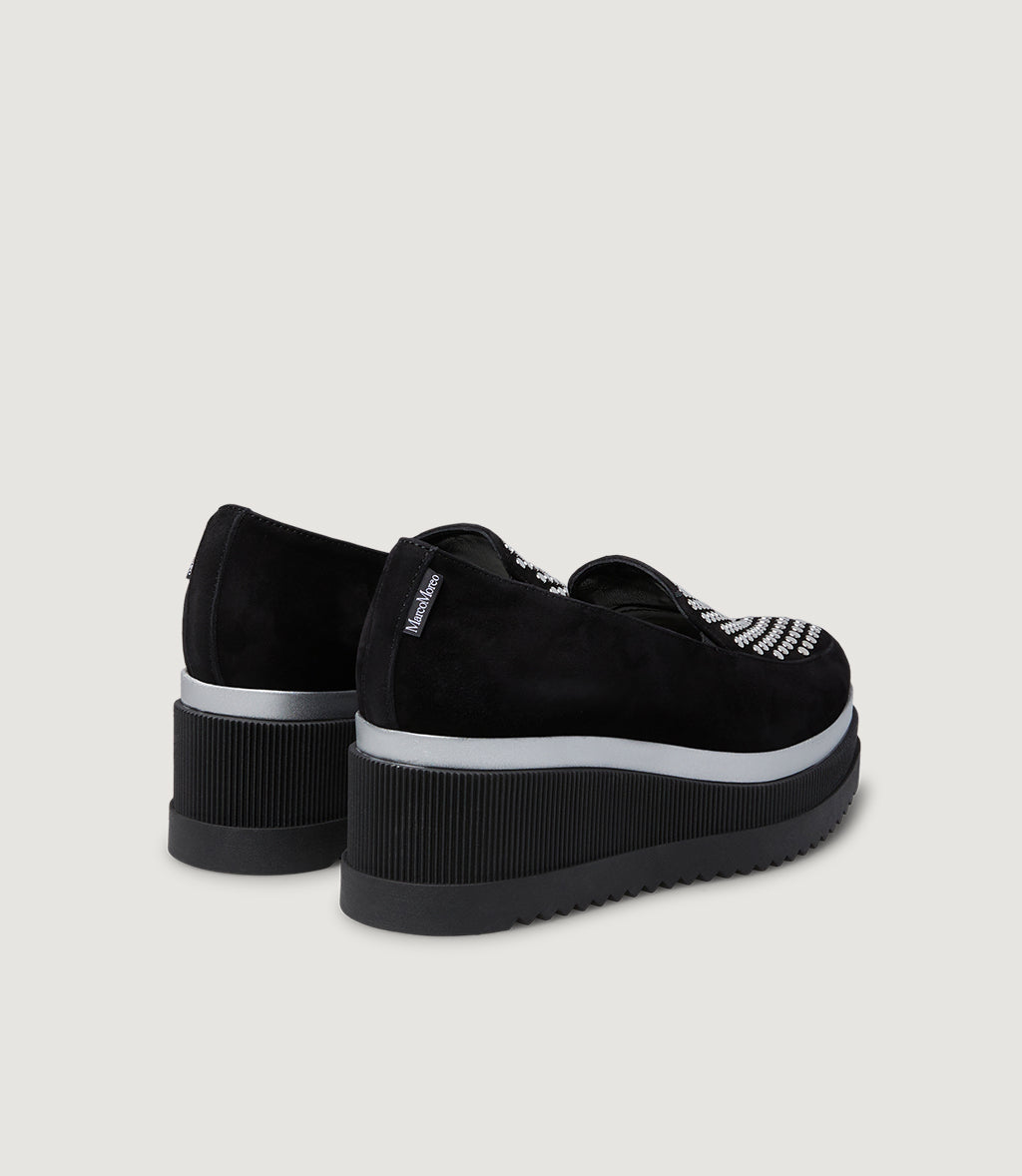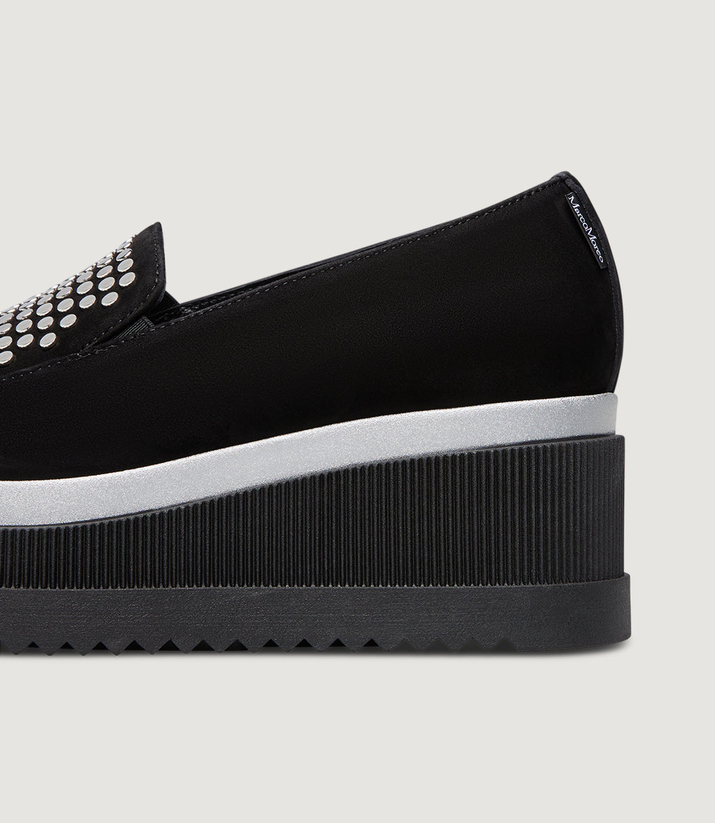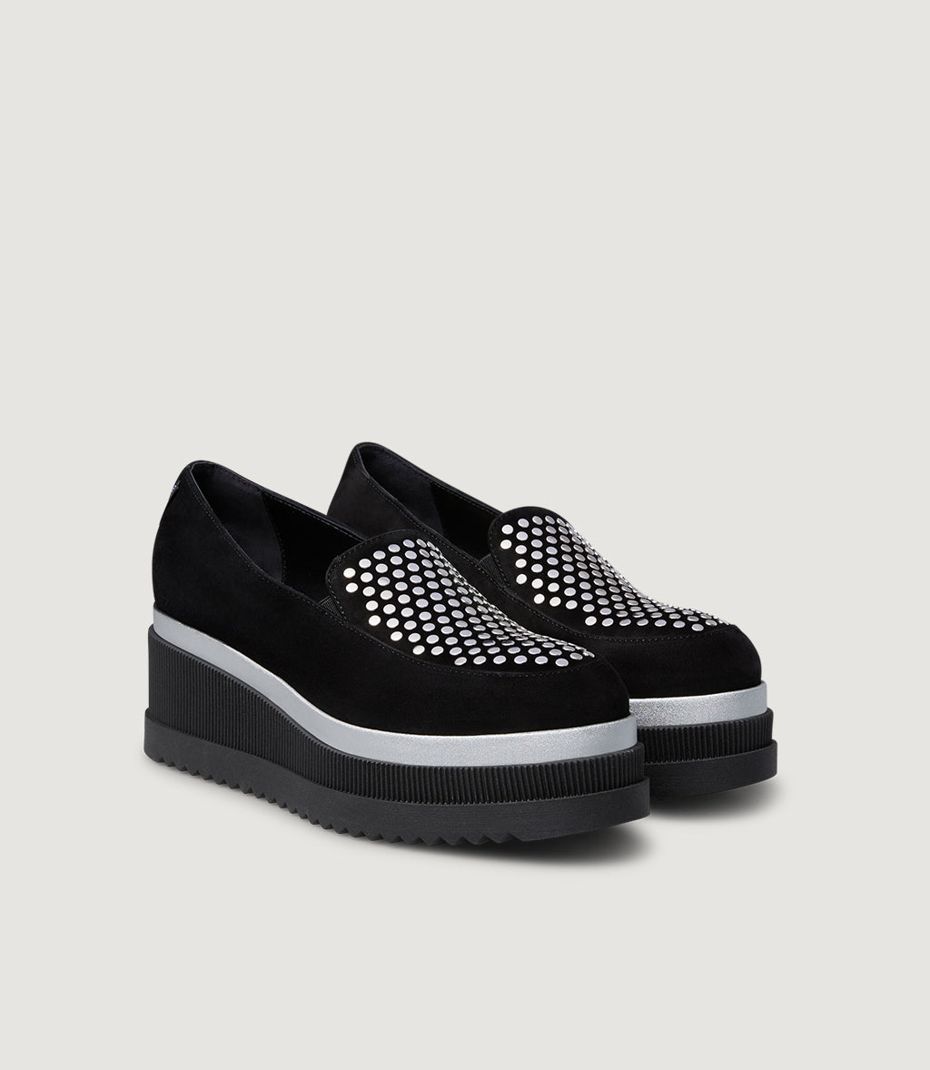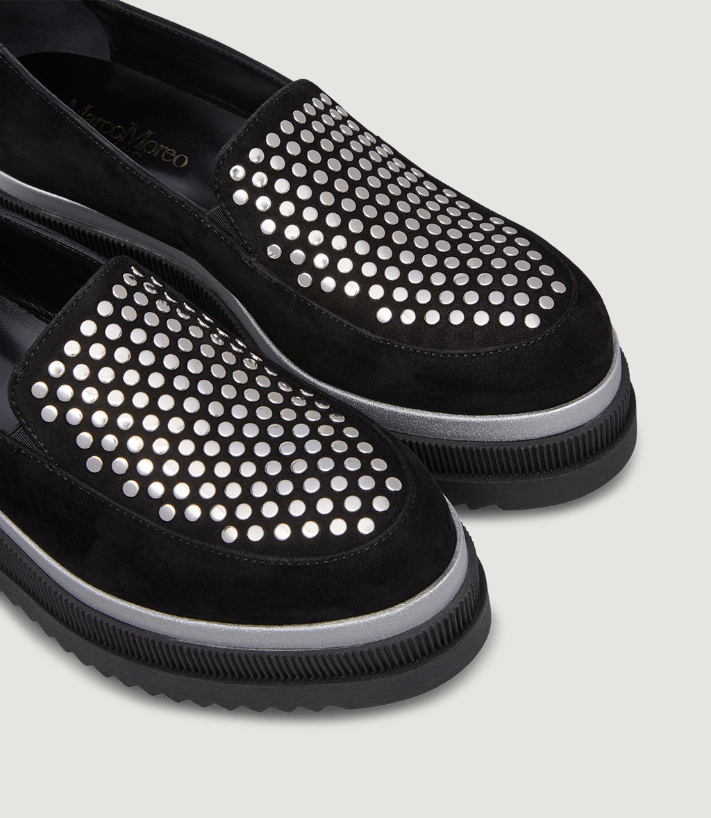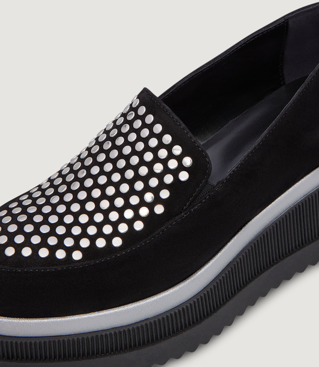 Our slip-on loafer with a playful edge. The velvety black and bordeaux suede upper is topped with a grid of glossy metal studs across the vamp, catching the light with every step. Clean lines, a rounded toe and discreet side gores keep the profile sleek and easy to wear.