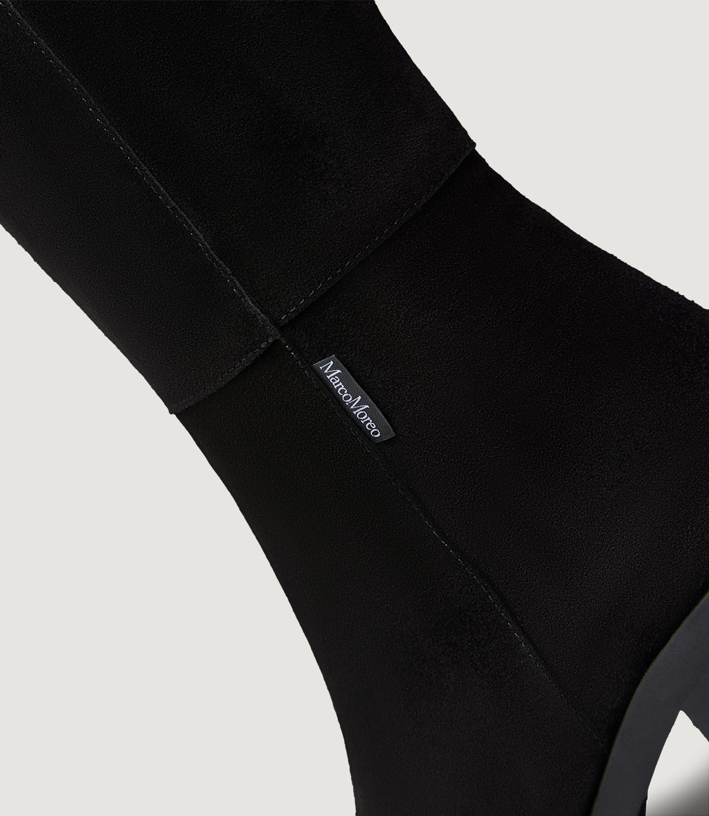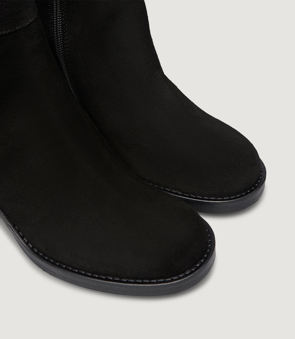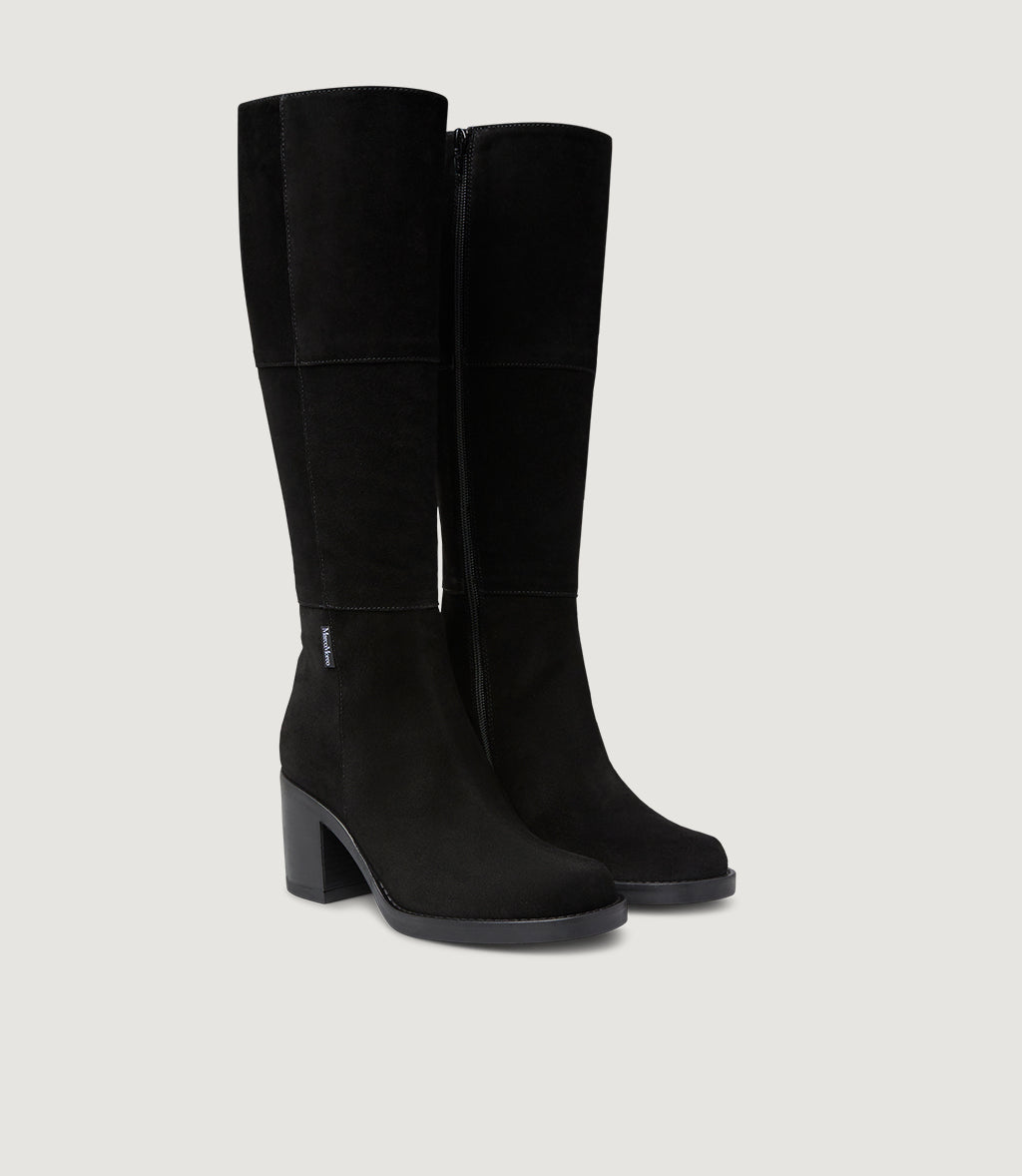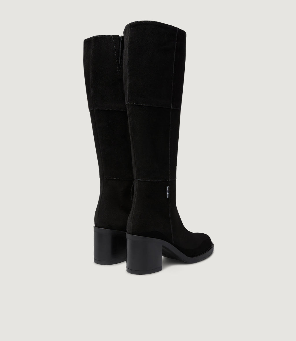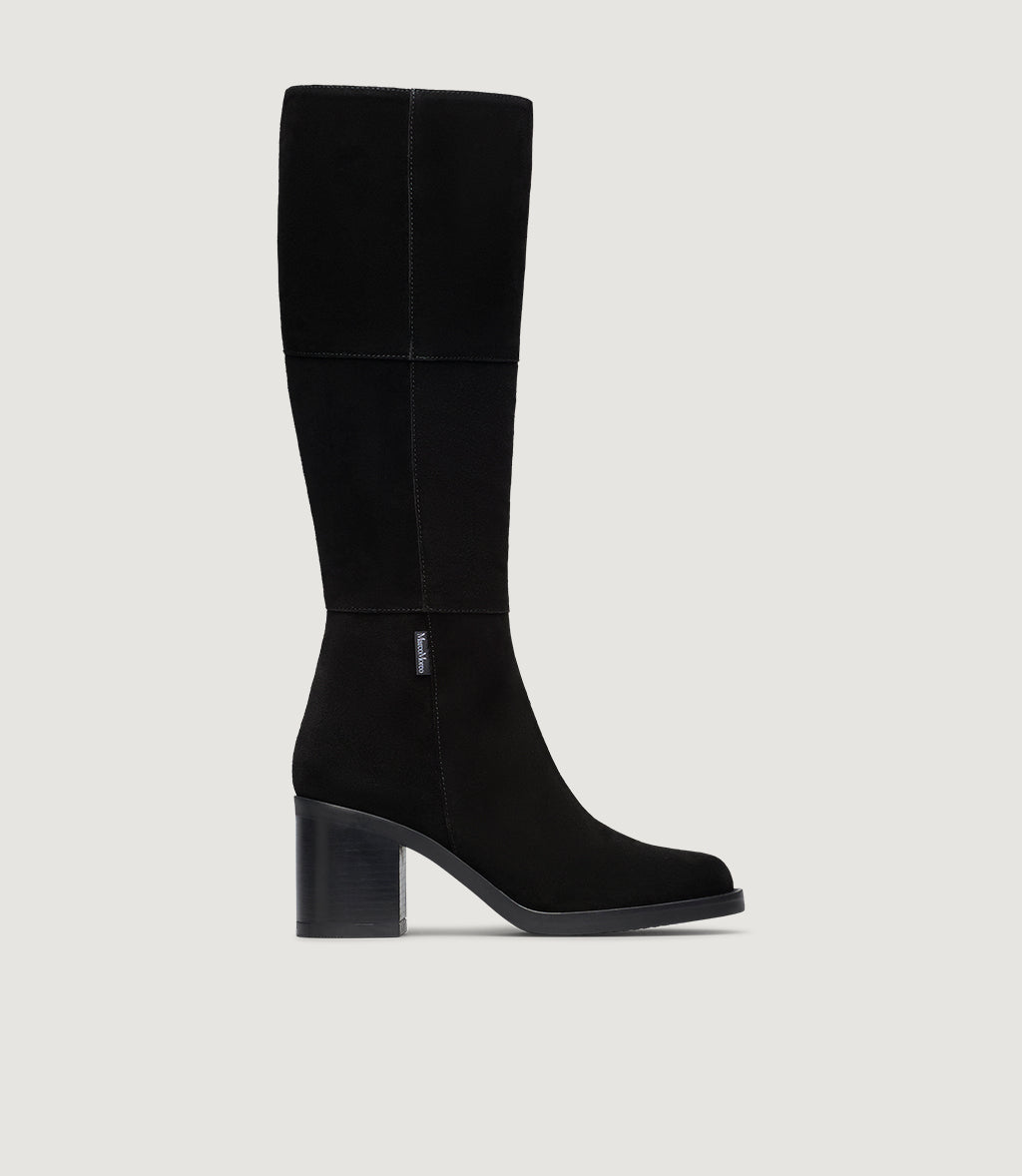 A sleek knee-high boot in deep black and brown with a velvety suede look, Sandra streamlines the leg with clean panel stitching and a slender, rounded toe.